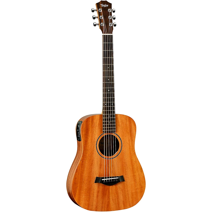 Conceived as a starter guitar for kids, the lovable Baby Taylor has maintained its enduring appeal in part by being a legitimate musical instrument that anyone can enjoy. The 3/4-size dreadnought helped touring musicians like Taylor Swift sketch new musical ideas on the road, and it's been a reliable musical accomplice for travelers seeking inspiration while trekking the world. A Sitka spruce top blends stiffness and elasticity in just the right proportions which translates into broad dynamic range with crisp articulation, while a layered sapele body creates a sturdy yet receptive platform for the vibrating string energy sent by the guitar's top. Layered wood is less succeptible to changes in temperature and humidity, making it an excellent choice for players who travel with their instruments or simply require more durability. This guitar also includes Taylor's ES-B system, which incorporates piezo design elements from the flagship Taylor ES2 system. Powered by a 9V battery, its onboard preamp includes a built-in digital chromatic tuner, an LED display for tuning and low battery indication, and a tone-sculpting 3-band EQ. All Baby Taylor models ship with a durable travel-worthy gig bag made by Taylor for optimal fit and protection.