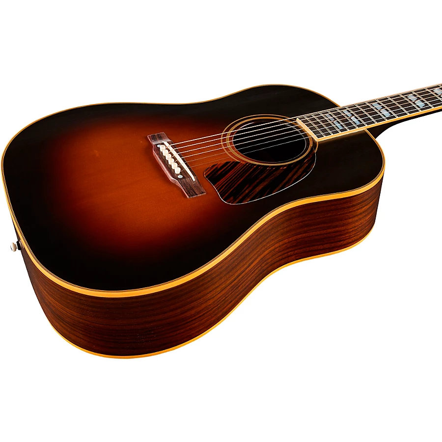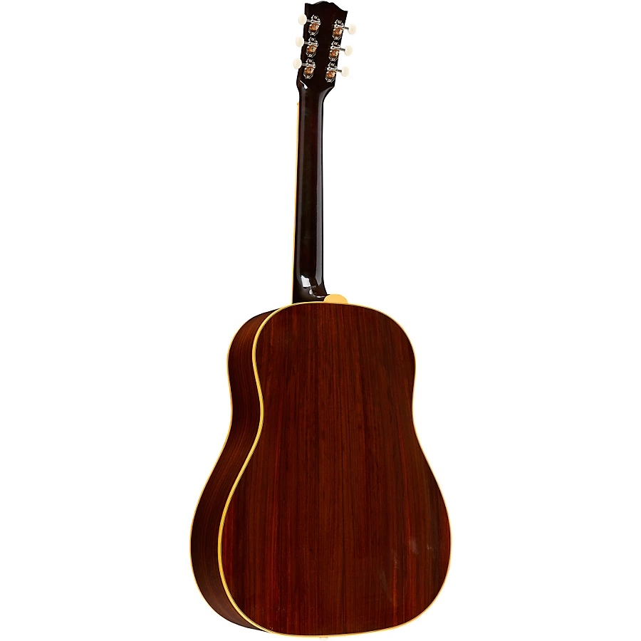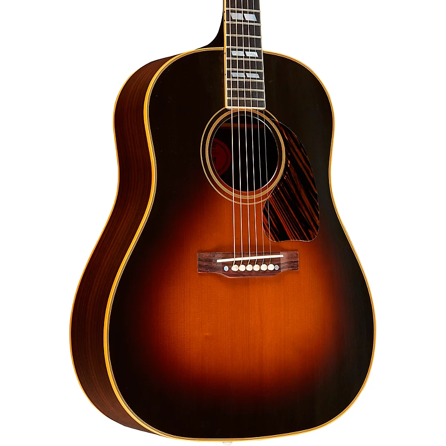 Gibson's Custom Shop Historic Reissue 1942 Banner Southern Jumbo revives the legendary tone and aesthetics of Gibson's pre-war era. Handcrafted with premium tonewoods including a thermally aged Adirondack red spruce top and rosewood back and sides, this acoustic guitar sings with a bold, punchy tone suited for blues, rock, and country. The 1.77" nut width and vintage styling pay homage to Gibson's original Southern Jumbo design from the 1940s.