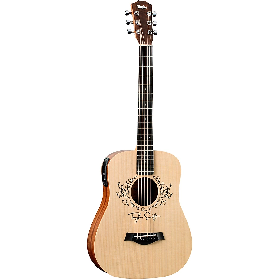 The Taylor Swift Signature Baby Taylor is inspired by the pint-size Baby Taylor used by Swift during her early days of touring. Recalling how the compact, portable Baby was a great songwriting tool for a girl on the go, Swift wanted to encourage others to express their feelings through music. This led to the development of her signature Taylor Swift Baby Taylor acoustic-electric. With a slim 1-11/16" neck and a compact shape, this guitar is just right for a young player or anyone who likes to pick up and play on the go. The three-quarter-size dreadnought that helped Taylor Swift sketch new musical ideas on the road can now be a reliable musical accomplice for anyone seeking inspiration while traveling the world. This model includes Taylor's ES-B electronics, which incorporates piezo design elements from the flagship Taylor ES2 system. Powered by a 9V battery, its onboard preamp includes a built-in digital chromatic tuner, an LED display for tuning and low battery indication and a tone-sculpting 3-band EQ. All Baby Taylor models ship with a durable travel-worthy gig bag made by Taylor for optimal fit and protection.