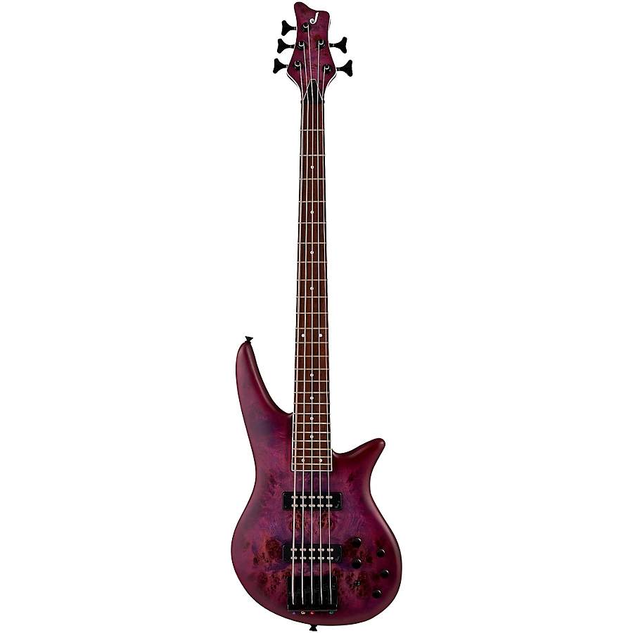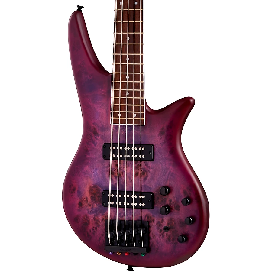 The X Series Spectra Bass SBXP V from Jackson blends modern style, flexible tone and outstanding value for the adventurous player on a budget. Featuring a poplar body with a large upper horn to evenly distribute weight throughout the instrument for balance and comfort, the SBXP V is designed with a graphite-reinforced through-body maple neck for ultra-durability. Dual passive medium-output humbucking pickups create a dynamic foundation with punch, power and note articulation. Wide-ranging tonal command comes from a two-way toggle switch for pickup coil splitting, 3-band active EQ, blend control and volume control with push/pull selector to bypass or engage active circuit for the 3-band EQ. A quick pull on the volume knob bypasses the active circuit, making it easy to regain sound from the bass without the use of battery power. This five-string, 35��-scale bass also features a HiMass hardtail bridge that enhances sustain and improves note attack. Budget-friendly and loaded with value, the X Series Spectra Bass SBXP V comes in standout Transparent Purple Burst with a unique 3x2 color matched headstock, understated ��J�� logo and black hardware.