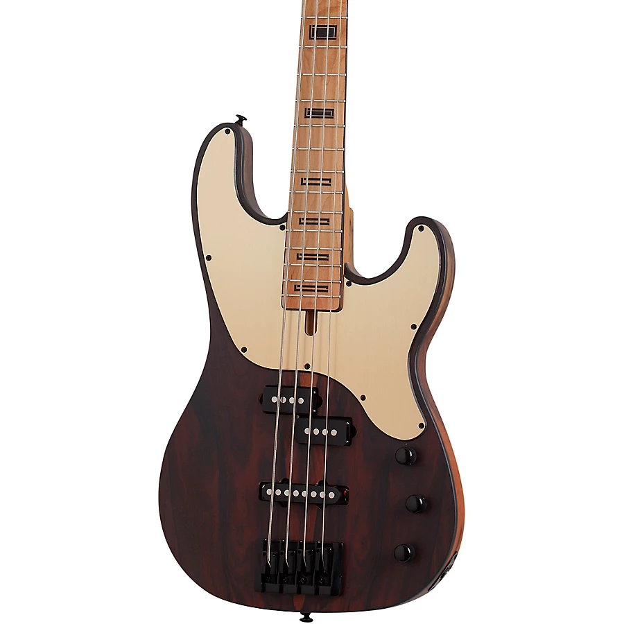 The Schecter Model T Exotic bass is a beautifully designed instrument with a striking look and warm, deep tone. The Model T Exotic features a ziricote top and black limba body paired to a roasted maple neck with a comfortable Thin C shape. This is topped with a roasted maple fretboard featuring block inlays for added class. A PJ pickup configuration delivers plenty of tone suitable for any playing style.