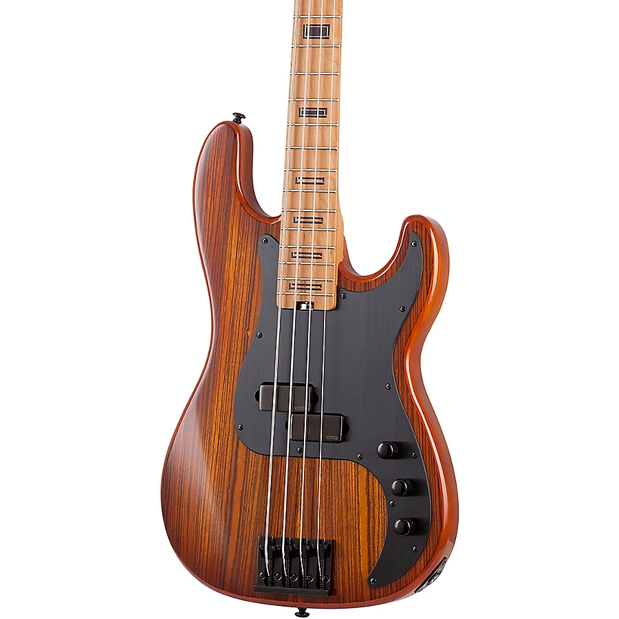 The P-4 Exotic Electric Bass from Schecter offers killer performance and retro style with an exotic twist. Designed for working musicians, the P-4 Exotic features a roasted maple fingerboard, roasted maple neck and zebrahead top for a smooth and comfortable playing experience. Loaded with an EMG Metal Works P pickup, this 4-string electric bass delivers brilliant high-end articulation, warm tone and incredible low end punch. Master volume and a 2-band EMG Active EQ bring full sonic customization right to your fingertips. Additional features include the Schecter High Mass bridge and WSC KG400 tuners for enhanced tuning stability.