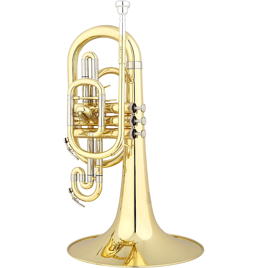 The Eastman EMP304 Marching Mellophone is tuned to the key of F with a .462" bore. This F Marching Mellophone features a rose brass leadpipe, a 10" yellow brass bell and three pistons. A mouthpiece and protective case are also included.