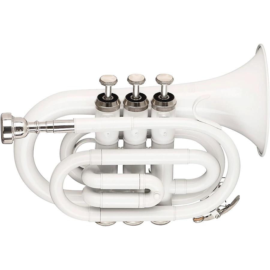 This Bb Pocket Trumpet features stainless steel valves and a brass leadpipe, along with a brass bell and body. It features a thumb saddle on the third valve slide, two water keys and includes a 7C silver-plated mouthpiece and a soft case with straps. Case dimensions are 11.02 x 8.66 x 5.51". The instrument is complete workshop tested and has a handsome clear lacquer finish.