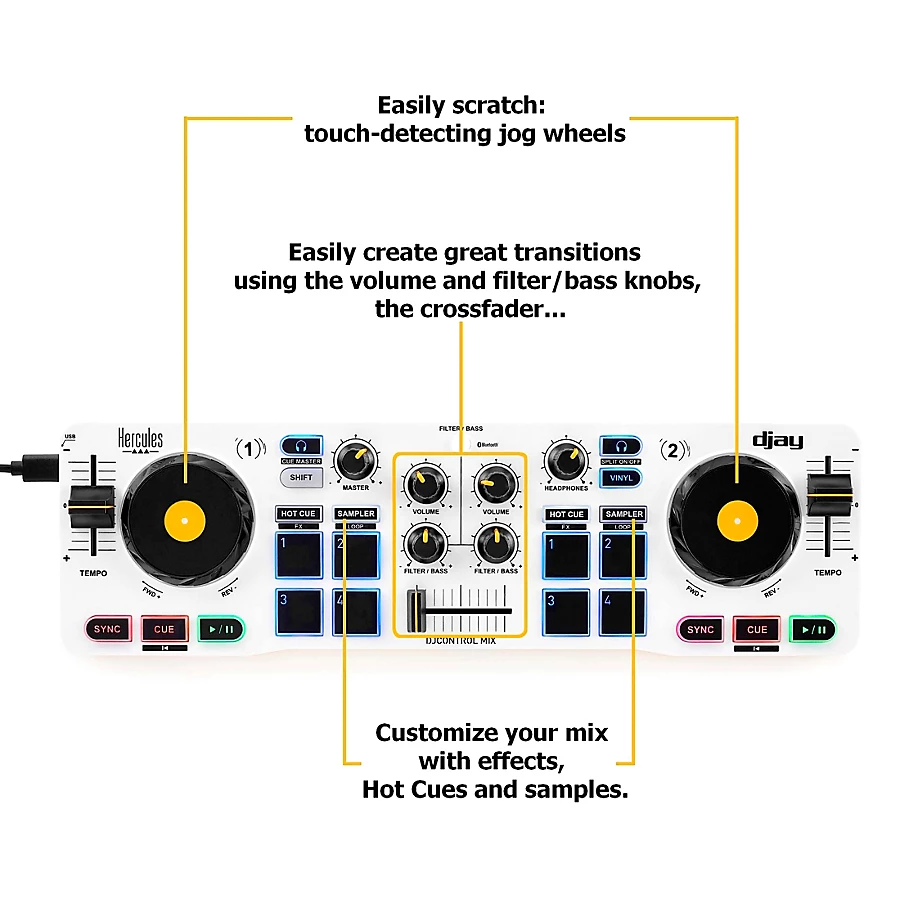 - Jog wheels for mixing and scratching, plus faders, knobs and pads: mix like you would on a full-size DJ controller
