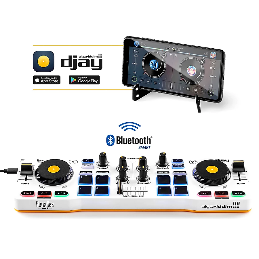 The Herculues DJControl Mix is a wireless 2-deck DJ controller specially designed for use with iOS and Android smartphones. It connects to your iOS or Android smartphone via Bluetooth Low Energy and controls the djay app.