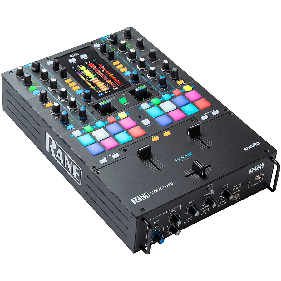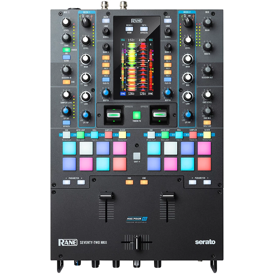 RANE's SEVENTY-TWO MKII battle-ready 2-channel DJ mixer unleashes the full power of Serato DJ Pro software. The MKII redefines the scope of possibility for Pro, Club and Scratch DJ/turntablists with features tailored for uninhibited performance: an interactive touchscreen for monitoring all critical functions; stackable Serato and Flex FX; ultralight MAG FOUR faders; customizable settings for instant doubles, silent cue and sync; dual DVS inputs; plus, expressive playback control through 16 multi-function trigger pads. For DJs seeking the ultimate in creative freedom and performance, look no further than the RANE SEVENTY-TWO MKII.