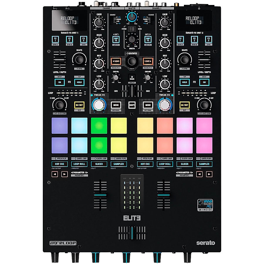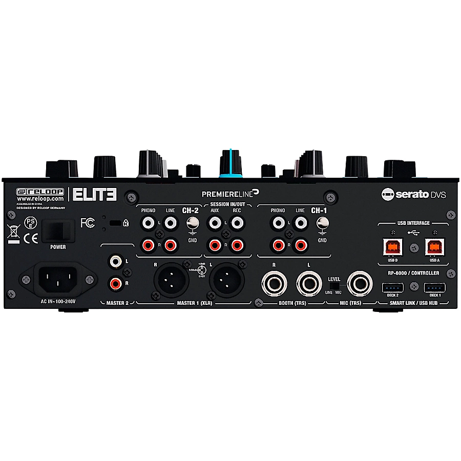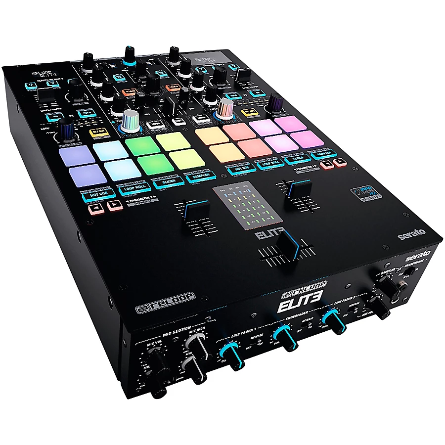 The Reloop ELITE 2-channel battle mixer is designed for use with Serato DJ Pro. It��s optimized for digital vinyl (DVS) integration and is built tough for professional DJs. Packed full of high-tech features, the Reloop ELITE DVS mixer lets you unleash your creativity. It includes the full version of Serato DJ Pro and DVS expansion pack for plug-and-play simplicity. Two Serato timecode control vinyl records are also included. Dual USB ports let two DJs perform simultaneously, so transitions are seamless.