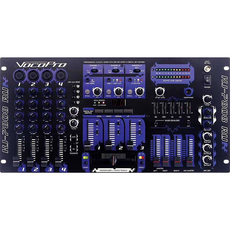 The KJ-7808RV mixer has tons of I/O power for microphones, auxiliary sources, video, and even a headphone. It's also got a 12V DJ lamp jack for professional production, talkover function, and LED Output Level Display meter.