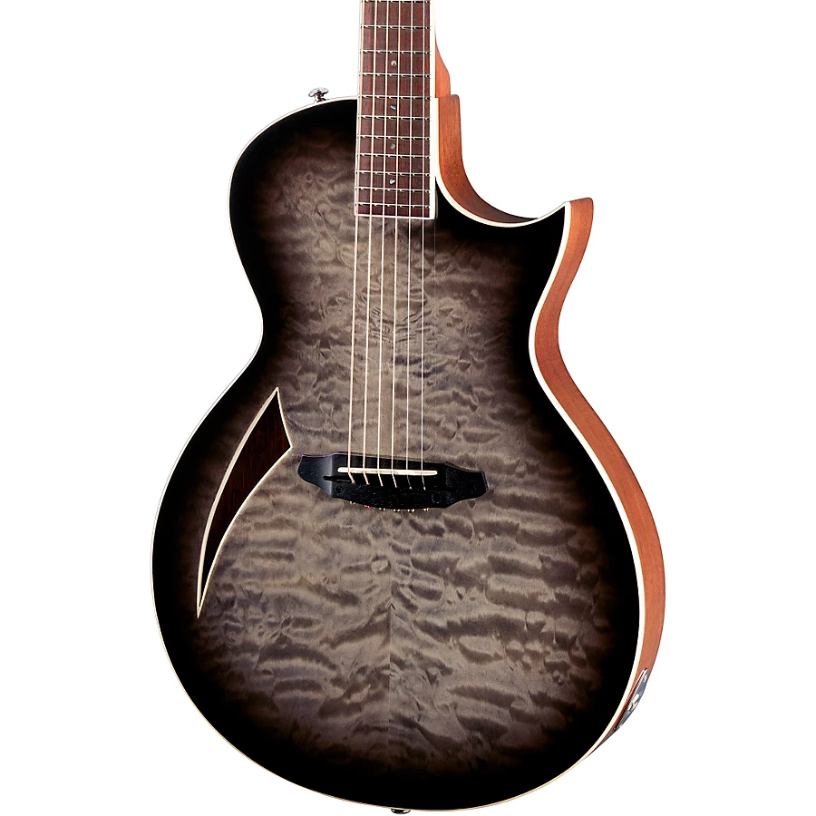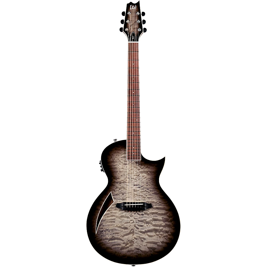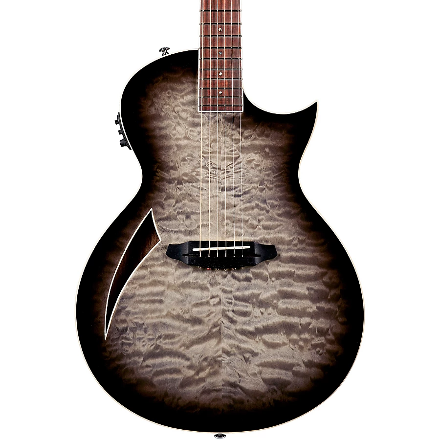 The ESP LTD TL-6 Thinline acoustic-electric guitar brings together the robust acoustic sound you love with the comfortable playing feel of an electric. This innovative TL-6 from ESP LTD features traditional set-neck construction and a chambered mahogany body topped with eye-catching flamed maple for full-bodied acoustic resonance. Its thin U-shaped 3-piece mahogany neck has a profile identical to many acclaimed ESP LTD electric guitars, making this an easy transition for electric players. The TL-6's rosewood fingerboard has 22 jumbo frets for buttery smooth playability across the entire neck. It comes equipped with a Fishman S-Core pickup and 3-band EQ preamp so you can shape your amplified acoustic tone with the turn of a knob. Grover tuners provide rock-solid tuning stability, while the TL-6's jatoba bridge ensures excellent intonation. Plug in the ESP LTD TL-6 and enjoy your favorite acoustic tones with the comfortable feel of your favorite electric.