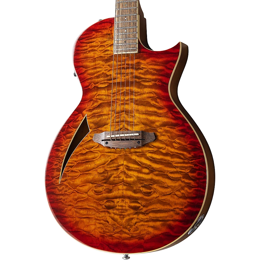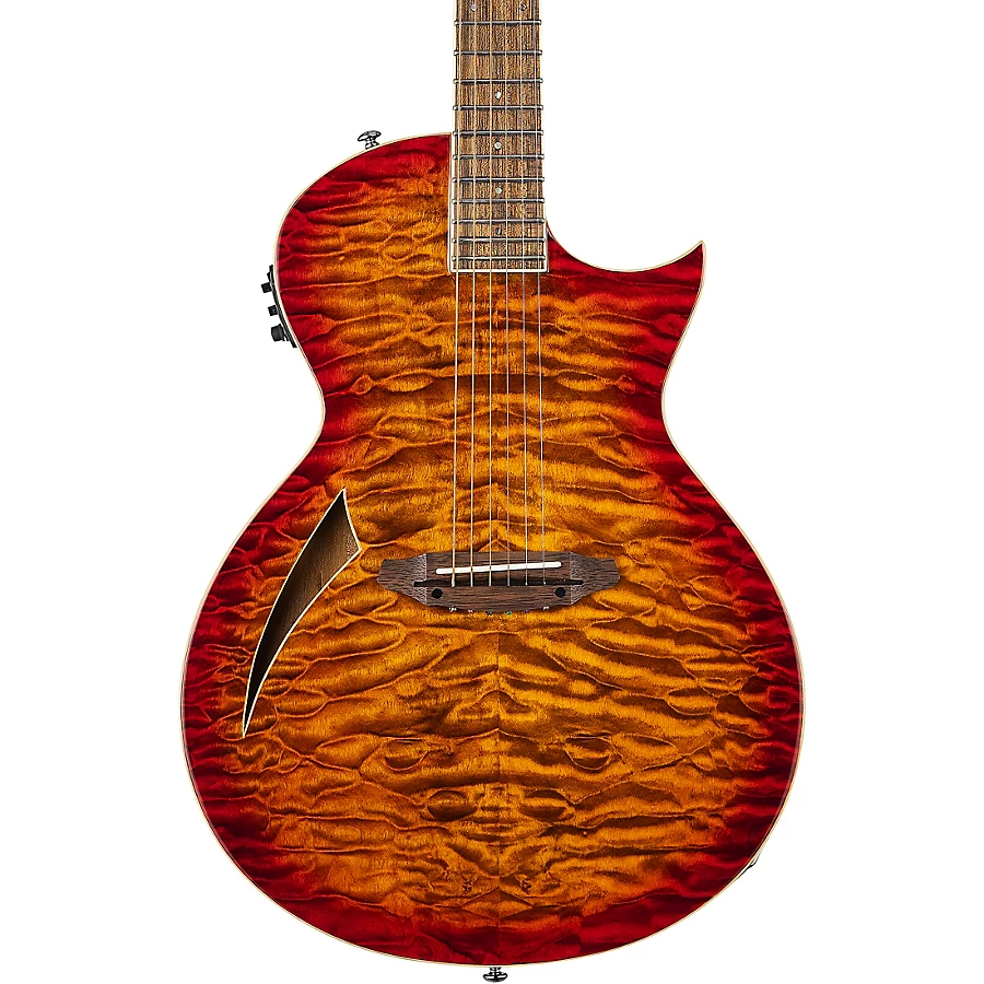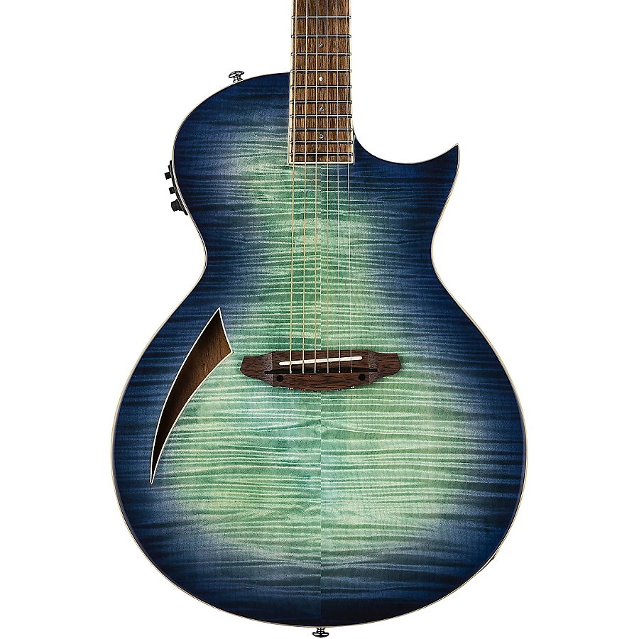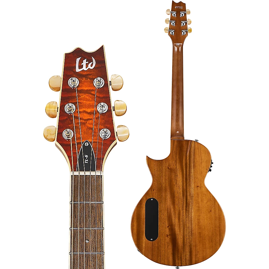 LTD��s TL Series, which includes this TL-6 Thinline acoustic-electric guitar, is a transducer-electric instrument collection that provides incredible acoustic tones with the comfortable playability and fast-neck feel of an electric guitar. The TL-6 offers high-quality woods and components, like a mahogany body, a three-piece mahogany neck, and a roasted jatoba fingerboard with 22 jumbo frets, as well as Grover tuners, Graphtech NuBone-XB nut and saddle, and a Fishman Sonicore pickup and TL-3 preamp with onboard tuner. We offer the TL-6 Thinline in three eye-catching models: the spruce top with a Winer Red finish, ?flamed maple tops with Aqua Marine Burst finish or quilted maple with Tiger Eye Burst finish.
