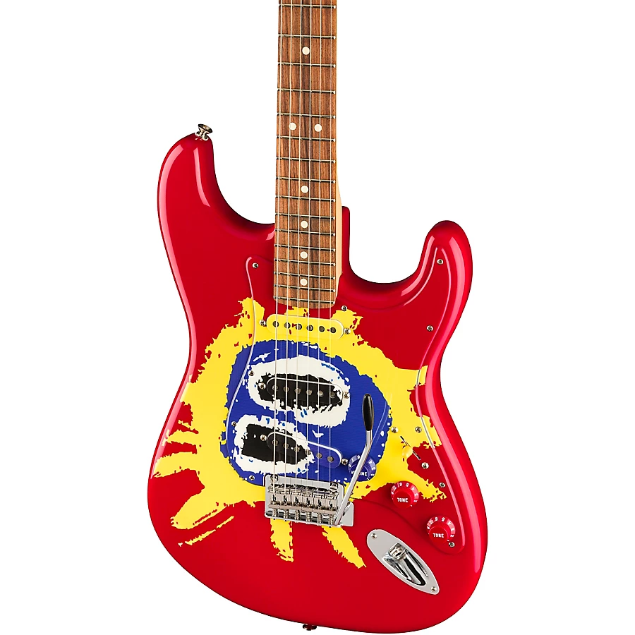 The 30th Anniversary Screamadelica Stratocaster from Fender celebrates Primal Scream��s 1991 breakthrough album, "Screamadelica." Featuring a fresh blend of indie-rock songwriting and acid house-inspired production, the album propelled the Scottish rock-n-roll band to international stardom. The limited-edition Screamadelica 30th Anniversary Stratocaster commemorates this pivotal recording with a one-of-a-kind all-over graphic of the stunning red, yellow and blue album art��including matching pickguard, pickup covers and knobs. A Modern "C"-shaped maple neck with a 9.5" radius pau ferro fingerboard and medium-jumbo frets provide modern playability and comfort, and the vintage-voiced Alnico V single-coil pickups deliver classic Fender tone. Other features include a 2-point synchronized tremolo, an ��F��-stamped neck plate and a convenient deluxe gig bag for portable protection.