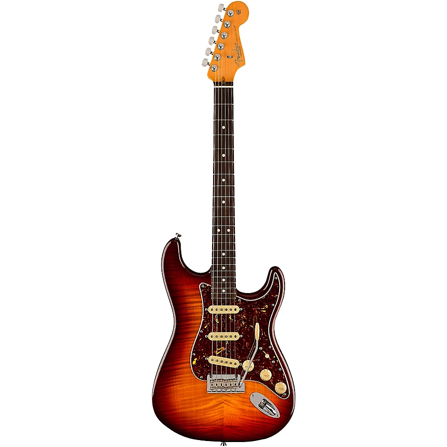 Combining a resonant alder body with a stunning flame maple top, accentuated by the limited Comet Burst finish and faux tortoiseshell pickguard, the 70th Anniversary Collection American Professional II Stratocaster is no piker when it comes to looks. The rolled-edge rosewood fingerboard on the Deep C profile "skunk-stripe" maple neck is fast and smooth, easy playing and as comfortable as your favorite jeans. Upper-fret access is made easier by the contoured neck heel.?