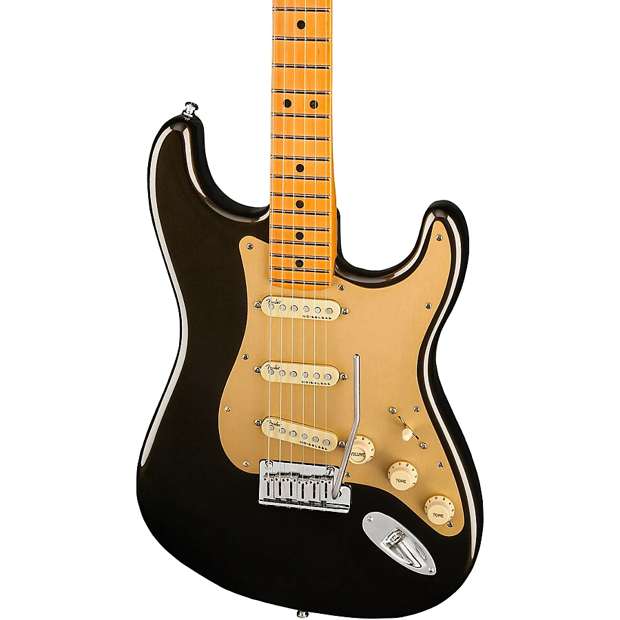 The Fender American Ultra Stratocaster is the latest evolution of the iconic Strat design. Loaded with innovative features catering to discerning players searching for ultimate precision, tone and comfort, this state of the art Stratocaster is a bold step forward. Sporting an alder body, maple "Modern D" neck and maple fingerboard, the American Ultra Stratocaster delivers a familiar feel with modern enhancements like a rolled compound radius fingerboard and a contoured neck heel for effortless access across the 22 medium jumbo frets. Powered by three Ultra Noiseless Vintage Strat single coil pickups, advanced wiring unlocks a myriad of hum free tones.