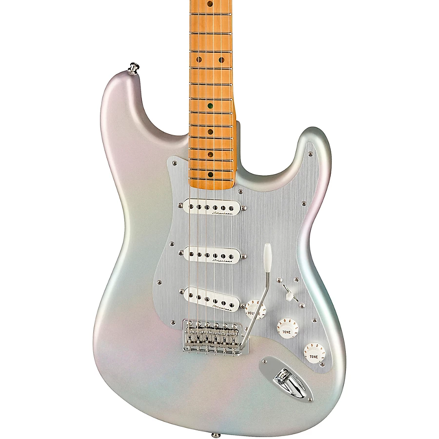 Finished in a dazzling Chrome Glow with a mid-'60s C-shaped maple neck, Vintage Noiseless pickups and an anodized aluminum pickguard, this Strat delivers effortless playability, classic tone and extraordinary style.