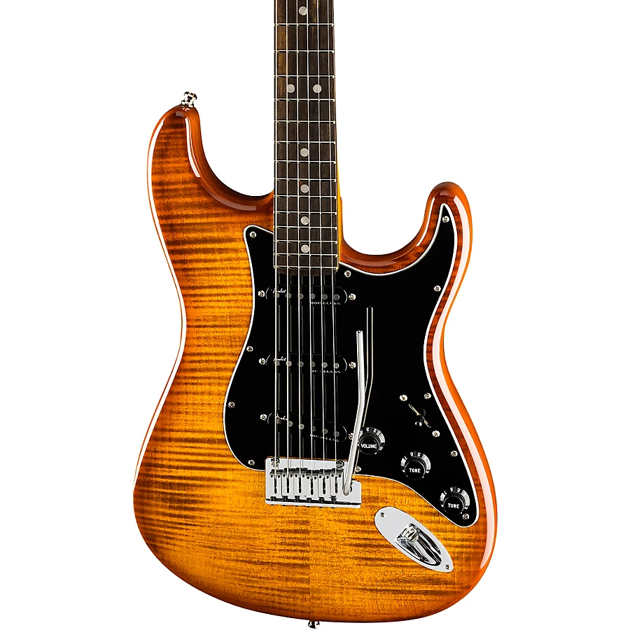 The Tiger's Eye finish on the American Ultra Stratocaster is simply stunning. The distinctive woodgrain pattern sparkles under stage lights, making this guitar an eye-catching centerpiece whether performing live or in the studio. The transparent finish allows the beautiful flame maple top to shine through, accentuating the unique characteristics of the wood. If you're looking for a guitar that makes a statement, the Tiger's Eye finish is sure to turn heads.