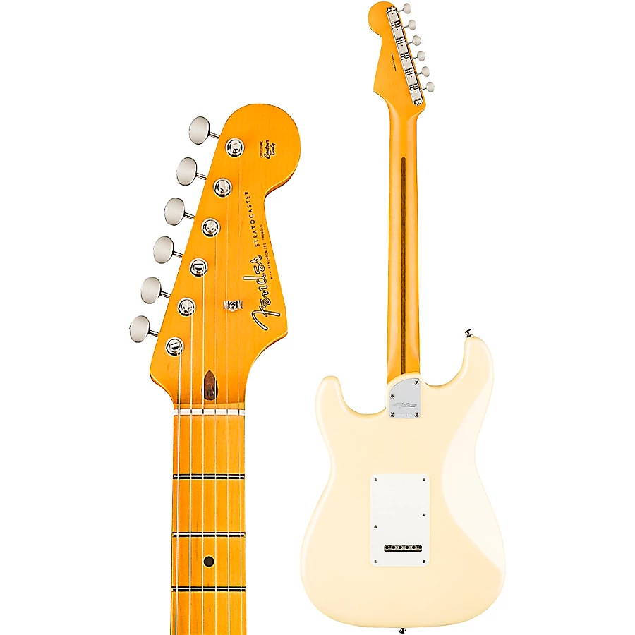 This Strat's Soft V maple neck and fingerboard are built for speed, comfort and performance. Maple lends a rigid, stable platform for the frets and tuners. Its smooth, nitrocellulose lacquer finish enables your hand to glide effortlessly up and down the neck, while the fingerboard's compound radius and medium-jumbo frets make higher-fret access and complex chords a breeze. On the headstock, vintage-style locking tuners impart a nostalgic feel to rock-solid tuning stability.
