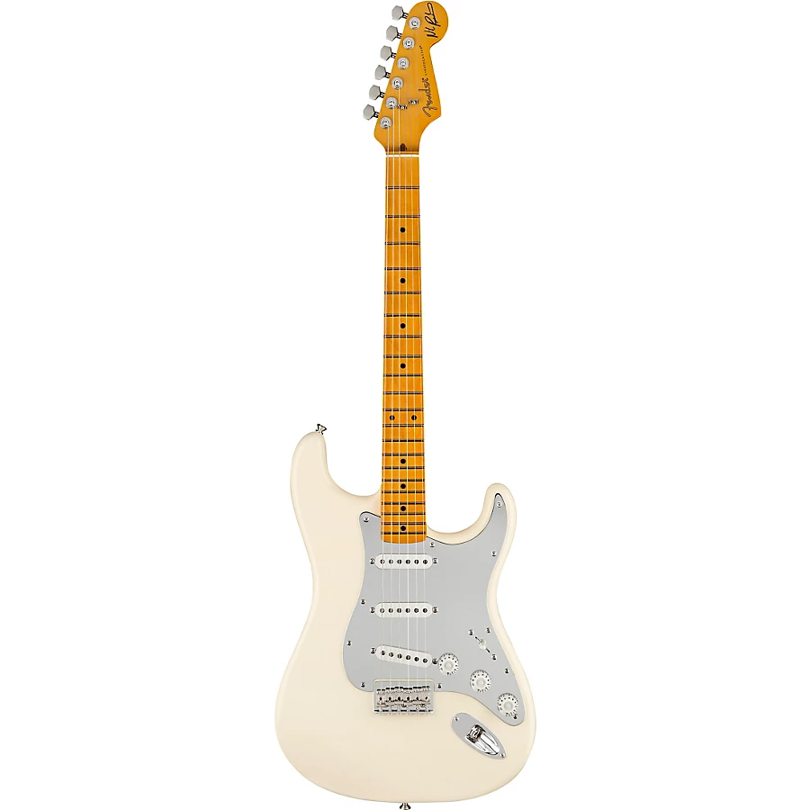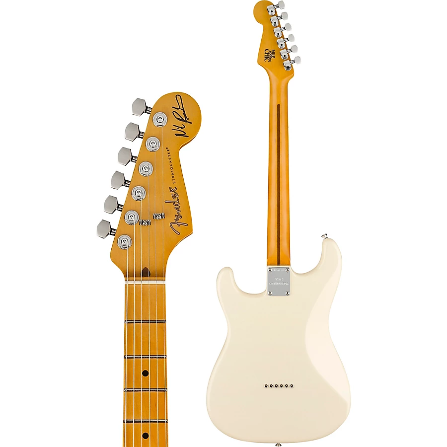 The Nile Rodgers Hitmaker electric guitar from Fender features a 1960s alder body that is uniquely smaller and more contoured than a typical vintage Strat. The beautiful lacquer matches the finish Nile sprayed on the guitar himself just after he acquired it in the early days of Chic. The custom ��59-profile one-piece maple neck has a 9.5" radius fingerboard, medium-jumbo frets and a satin finish. A ��Nile Rodgers & Chic�� logo adorns the back of the headstock and a custom Hitmaker logo is stamped into the neck plate. The Nile Rodgers Hitmaker single-coil Strat pickups are voiced to accurately replicate the quack, chime and bell-like clarity of the original Hitmaker. Other features include a hard-tail string-through bridge with period-correct bent-steel saddles, an eye-catching mirrored chrome-plated brass pickguard, locking Sperzel tuners and a set of white speed knobs. The guitar also comes with a vintage-style case with Hitmaker-embroidered interior and a custom certificate of authenticity.