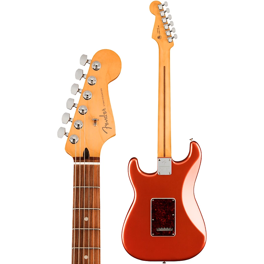 Fusing classic Fender design with player-centric features, this Player Plus Stratocaster with Pau Ferro fingerboard delivers superb playability and unmistakable style. At the heart of this Strat is a trio of Player Plus Noiseless pickups�Cbright and touch sensitive, they offer classic Strat tone without hum. A push-pull pot on the tone control adds the neck pickup to switch positions 1 and 2 for two sounds not usually found on a Strat. The silky satin Modern ��C�� Player Plus Strat neck fits your hand like a glove, with smooth rolled edges for supreme comfort. The 12�� radius fingerboard and 22 medium-jumbo frets facilitate fluid leads and choke-free bends. Smooth and responsive, the 2-point tremolo provides classic vibrato effects, while the locking tuners provide rock-solid tuning and make string changes quick and easy. With classic Fender style, the Player Plus Stratocaster is the perfect tool to spark your creativity and stand out from the crowd.