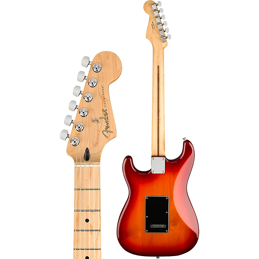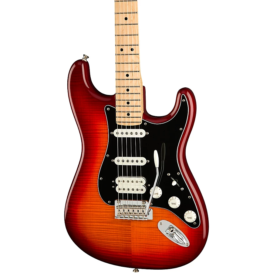 The Fender Player Stratocaster HSS Plus Top, a guitar packed with authentic Fender tone and feel that pushes the boundaries of creativity. Featuring an alder body with a stunning flame maple top finish, this Stratocaster is ready to take center stage. Its trio of Player Series pickups��a bridge humbucker and two single-coils��provide a versatile range of tones from bell-like highs to robust lows. The modern C-shaped maple neck offers a smooth, comfortable playing experience, while the 9.5" radius fretboard makes it easy to bend notes and play complex chords.