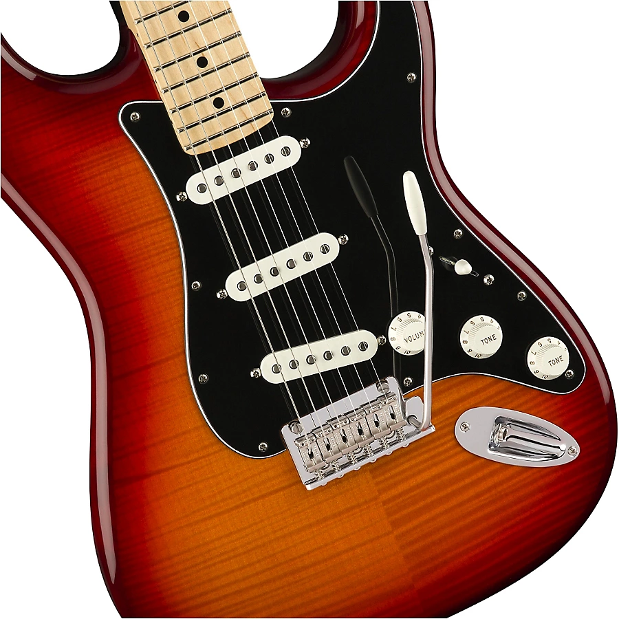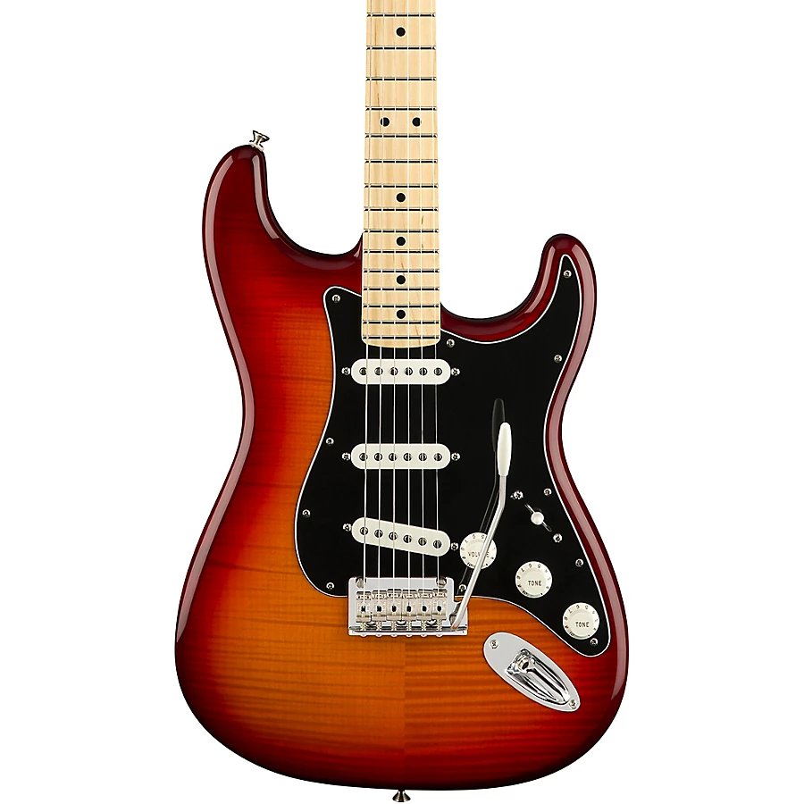 Over the decades, players have been continually inspired by the sound of a Strat. From the clarity of the high end, through the gut punch of the mids and the solid lows, it's a sound that's helped define what an electric guitar should be��versatile enough for any style and broad enough for any player to find an individual voice. This Player Series Stratocaster puts all of the classic features of the Strat at your fingertips while adding a modern edge. With a beautifully flamed maple top over a solid alder body, a 22-fret maple fingerboard with a contemporary 9.5" radius for easy bending and an updated 2-point fulcrum tremolo bridge, the Player Series Stratocaster Plus Top is primed and ready to carry you along your musical voyage.