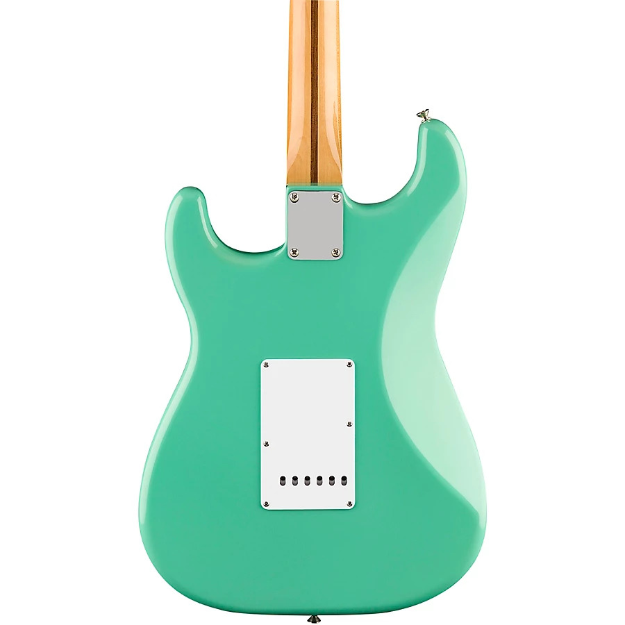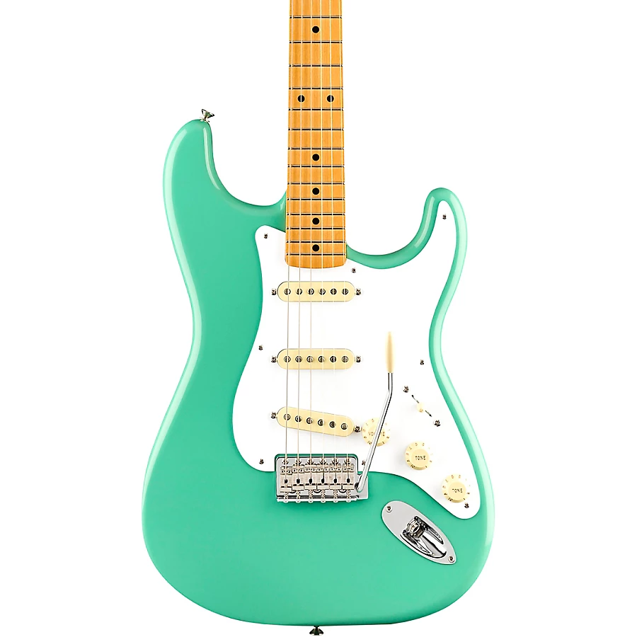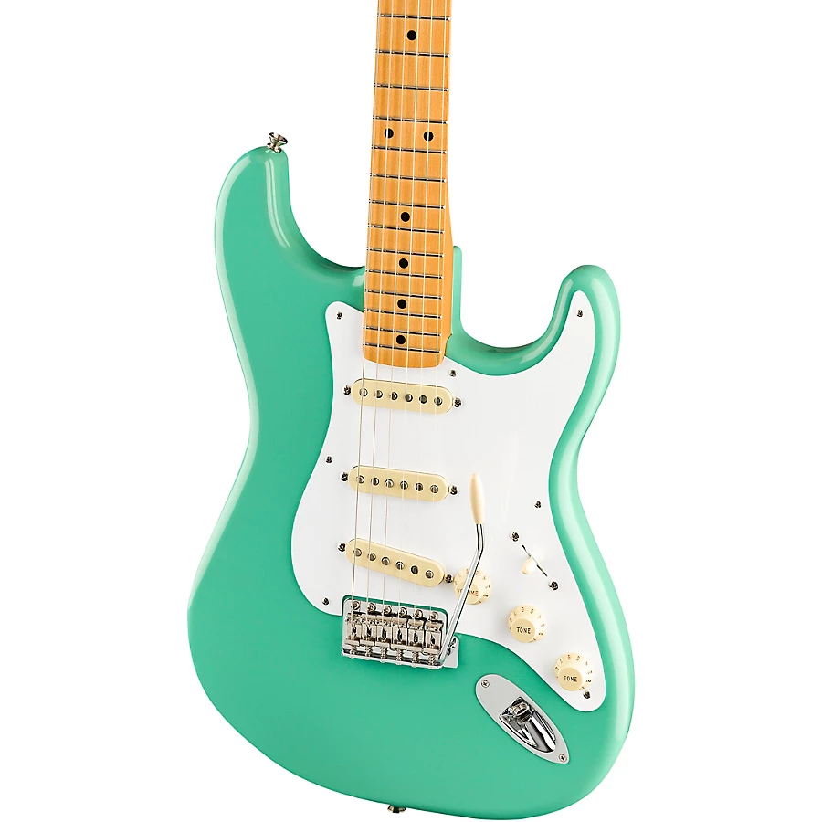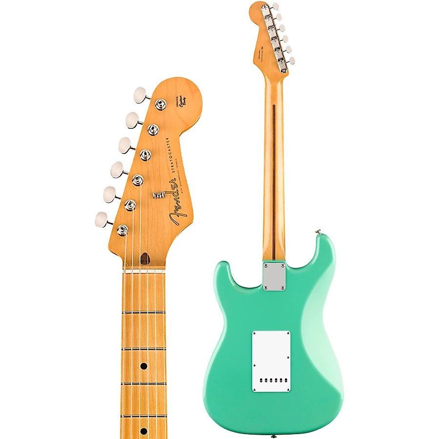 The updated ��Soft V��-shaped neck has a 7.25��-radius maple fingerboard with 21 vintage-style frets for classic playing feel. A vintage-style, six-point synchronized tremolo and vintage-style tuning machines provide original-era aesthetics, rock-solid performance and tuning stability. Other features include vintage-style strap buttons, 5-way pickup switching and the traditional Strat control layout. Includes deluxe gig bag.