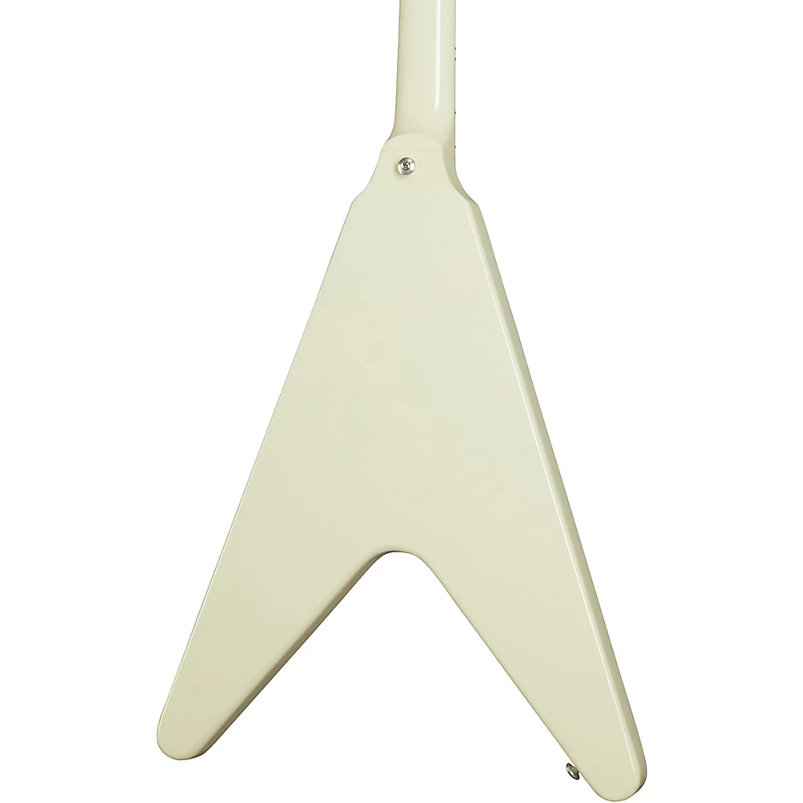 Thee Gibson '70s Flying V Electric Guitar Classic White is a reissue of the legendary electric guitar that helped define the sound of rock. With its striking yet comfortable asymmetrical body shape, bound rosewood fretboard and uncovered '70s Tribute Burstbucker pickups, this Gibson Flying V provides the look and tone that shaped an era. Now with a slim taper neck for effortless soloing and available in a crisp Classic White finish with matching headstock, the Gibson '70s Flying V offers a perfect blend of '70s style and contemporary playability.