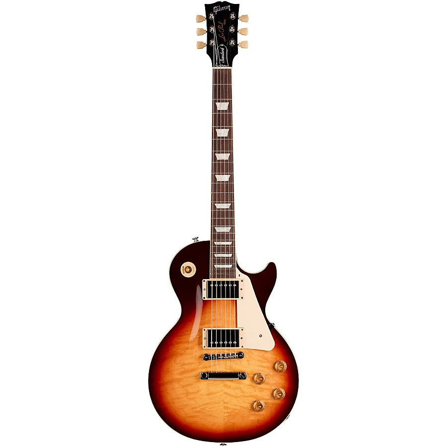 From its aged gold top hat knobs to keystone tuner buttons, the Les Paul Standard '50s Quilt nails iconic '50s Gibson style. The ABR-1 bridge and aluminum stopbar tailpiece provide rock-solid tuning stability and sustain, while giving a period-authentic look. Vintage deluxe tuners maintain precise pitch with their 18:1 gear ratio. Orange Drop capacitors and audio taper potentiometers retain faithful tone. With its ornate pickguard and bound body and neck, this Les Paul looks every bit the '50s classic.