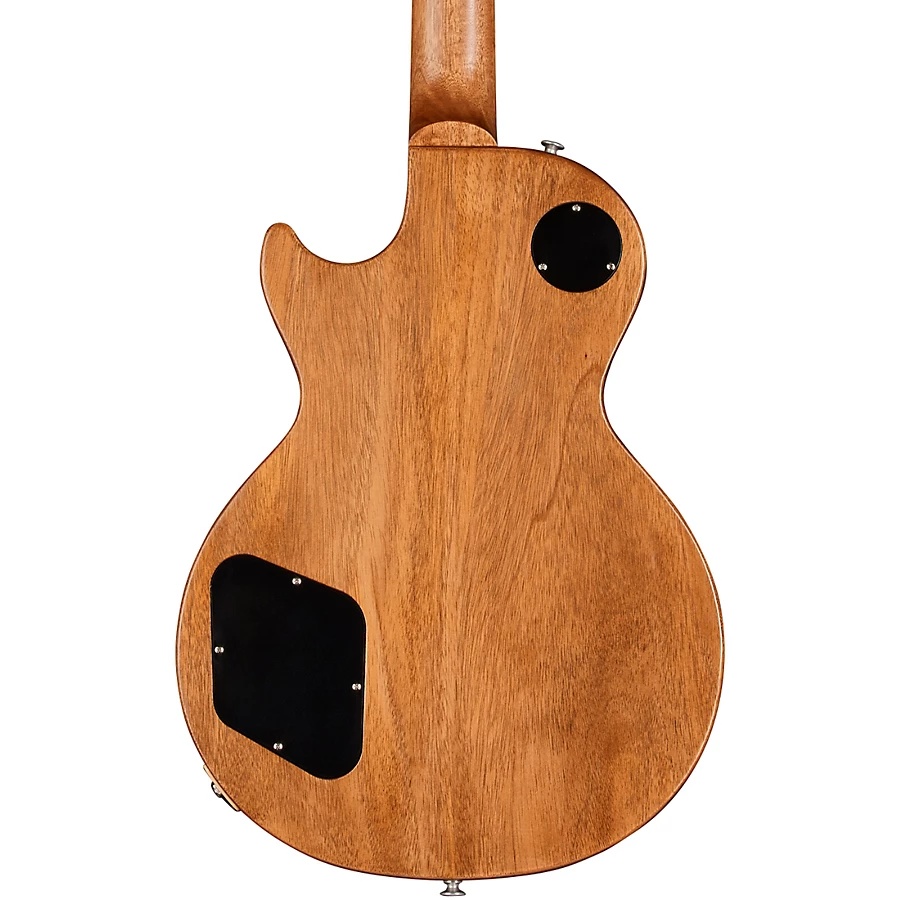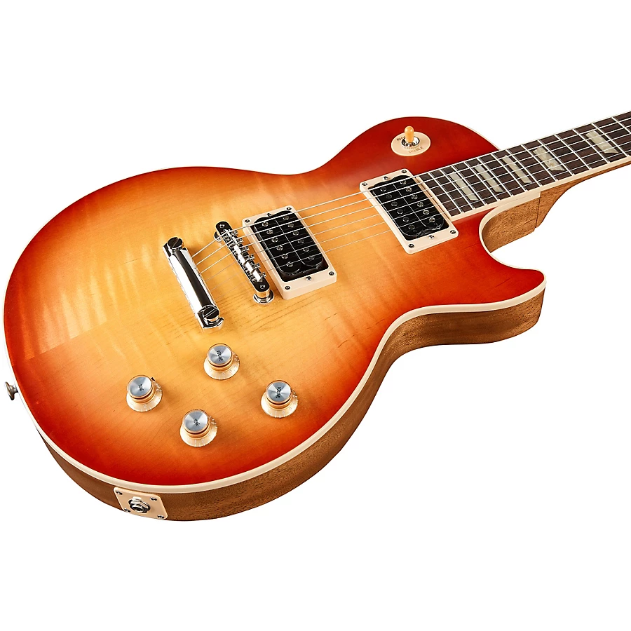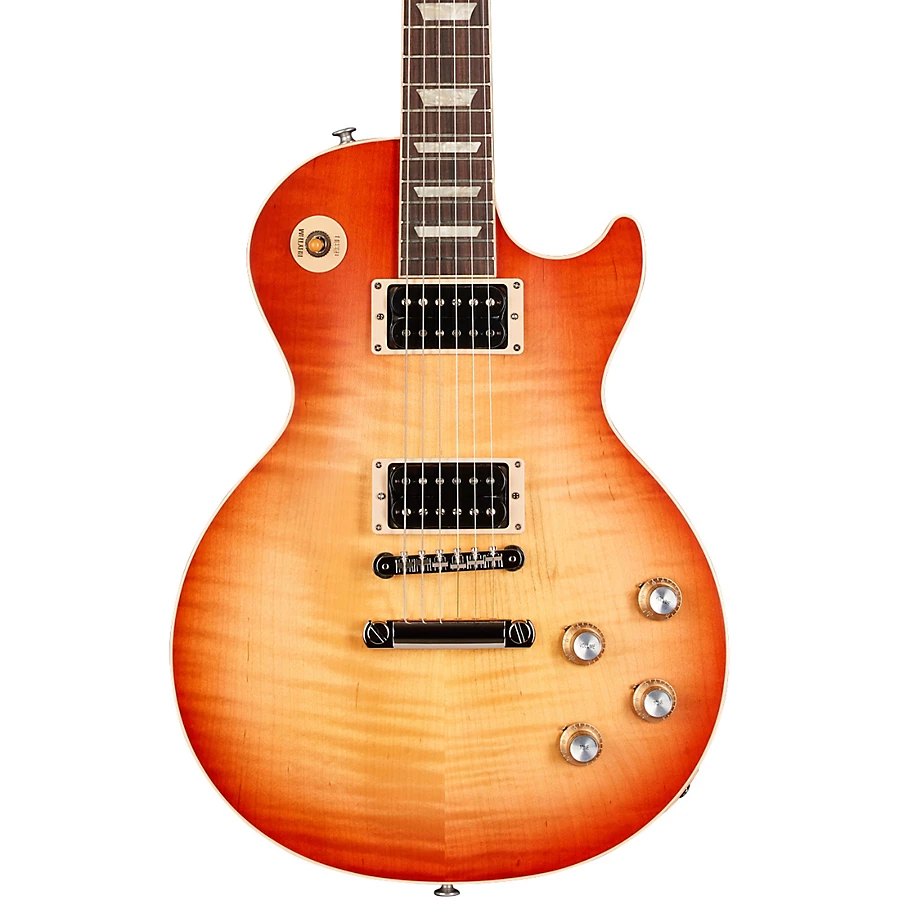 The Gibson Les Paul Standard '60s Faded electric guitar pays tribute to Gibson's golden era of innovation. It features a satin nitrocellulose lacquer finish that gives it the look and feel of a long-treasured companion. The solid mahogany body is paired with an AA figured maple top, and a SlimTaper '60s-style mahogany neck with a rosewood fingerboard and trapezoid inlays.