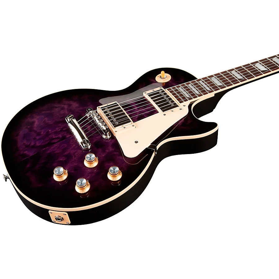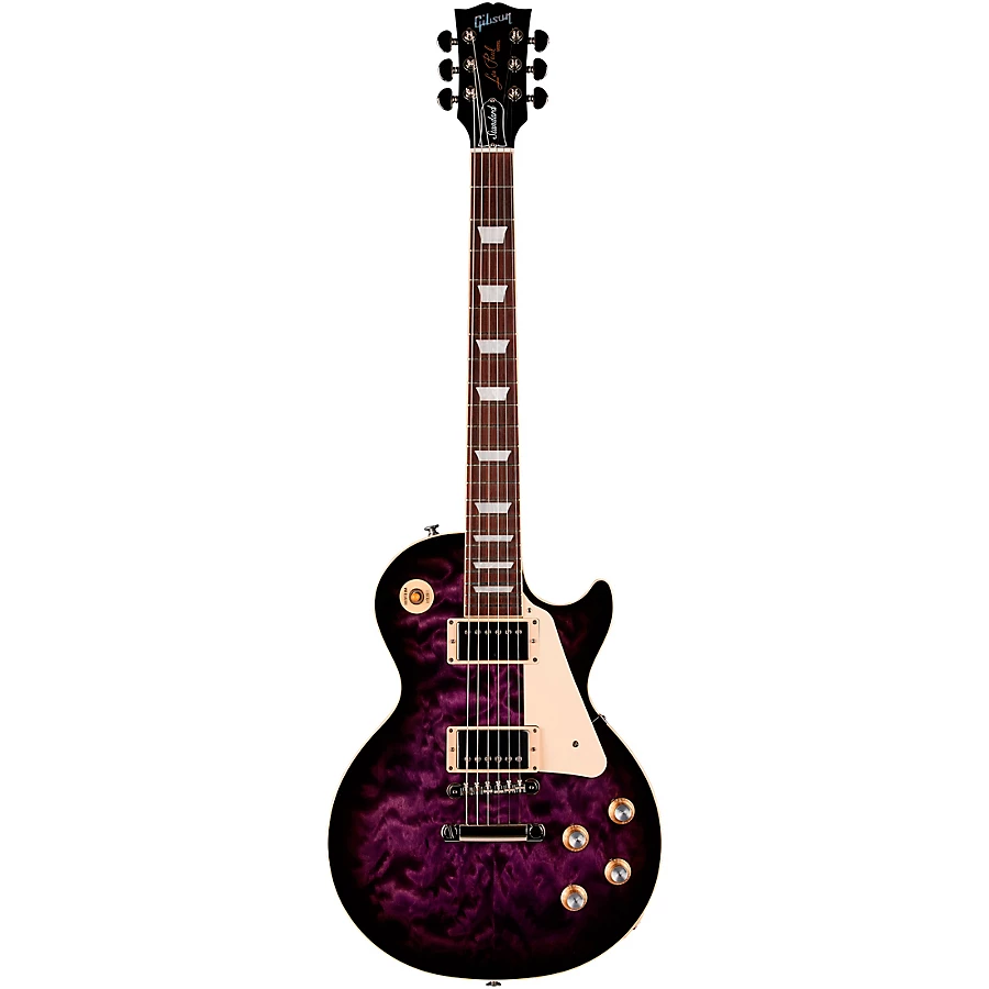Visually, the Gibson Les Paul Standard '60s Quilt makes an eye-catching statement with its transparent purple burst finish on a beautifully figured maple top. The bold yet classy color palette gives this Les Paul an extra degree of flair. As a limited edition model, it will stand out from other Standards. The vintage-inspired '60s neck profile, gold hardware and engraved pickguard complete the nostalgic design. Own a special piece of Gibson history and experience the Les Paul tone and playability that has made it an icon for over 60 years.