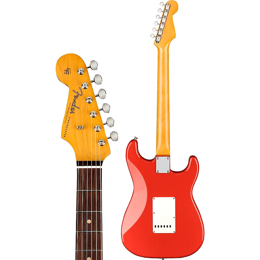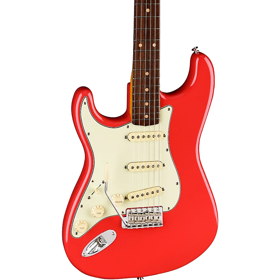 The Fender American Vintage II 1961 Stratocaster left-handed electric guitar celebrates the popularity and aesthetic evolution of the Stratocaster in the early ��60s, including bold finishes and a 3-ply pickguard accenting its signature curves. Featuring a premium alder body, a trio of Pure Vintage ��61 Stratocaster pickups and a medium C-shaped maple neck paired with a 7.25"-radius slab rosewood fingerboard, the American Vintage II 1961 Stratocaster reproduces the quintessential tone and feel of the original. Other appointments include a vintage-accurate synchronized tremolo with cold rolled steel block and bent steel saddles, single-line ��Fender Deluxe�� tuners and a bone nut. Comes with a vintage-style brown case with an orange interior.