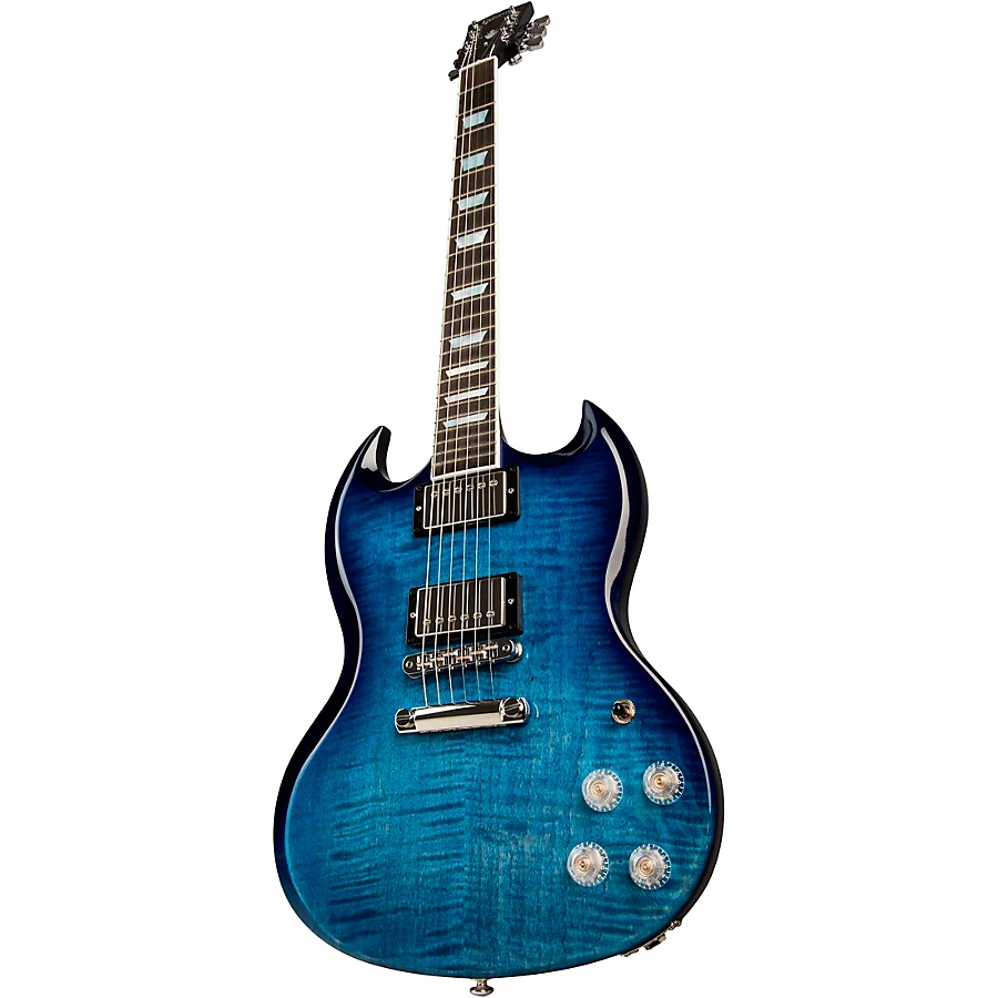 The Gibson SG Modern is a revolutionary electric guitar that fuses classic SG styling with contemporary appointments sought after by today's players. Its solid mahogany body provides the resonant tone and sustain the SG is known for, while the figured maple top adds striking looks and warmth. The genuine ebony fretboard with 24 frets and a compound radius offers a familiar feel and fluid playability. BurstBucker Pro humbuckers powered by Alnico V magnets deliver the output and clarity required by modern music. Push-pull volume controls unlock single-coil tones from the humbuckers at the flip of a switch.