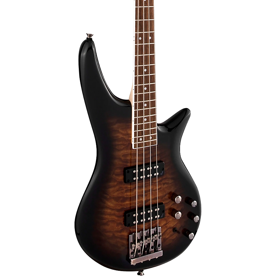The Jackson JS Series Spectra Bass JS3Q, with its offset body style, was designed with the artist in mind. The poplar body with quilt maple top features a large upper horn that evenly distributes weight throughout the instrument, providing perfect balance by reducing neck dive for hours of comfortable playing. A -graphite-reinforced bolt-on maple neck with scarf joint design generates formidable sustain, while the speed neck contour and 12"-16" compound radius laurel fingerboard with 24 frets make for lightning-fast playability.