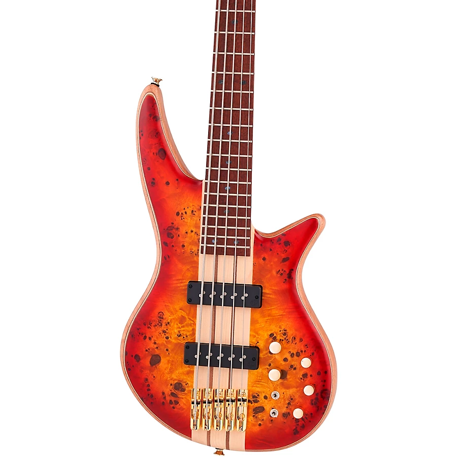 The Pro Series Spectra Bass SB V from Jackson is a bold, finely crafted instrument designed to deliver style, tone and playability to the demanding bassist. Starting with style, the all-new Pro Series Spectra Bass SBP V features a unique multi-laminate poplar burl/walnut/maple/walnut/mahogany body wrapped in an elegant Transparent Cherry Burst finish, complete with a unique 3x2 color matched headstock with an understated "J" logo and black hardware. The through-body five-piece maple/walnut/maple/walnut/maple with graphite reinforcement ensures ultimate stability and formidable sustain, while a speed neck contour and 12"-16" compound radius fingerboard offer superior playability. Featuring alnico V magnets, the Nordstrand SB5 single-coil soapbar bridge and neck pickups deliver an all-around pulverizing and striking sound with bright, clean and punchy characteristics. This five-string, 35"-scale bass also features a Jackson Single-String hardtail bridge that enhances individual note attack and improves sustain.