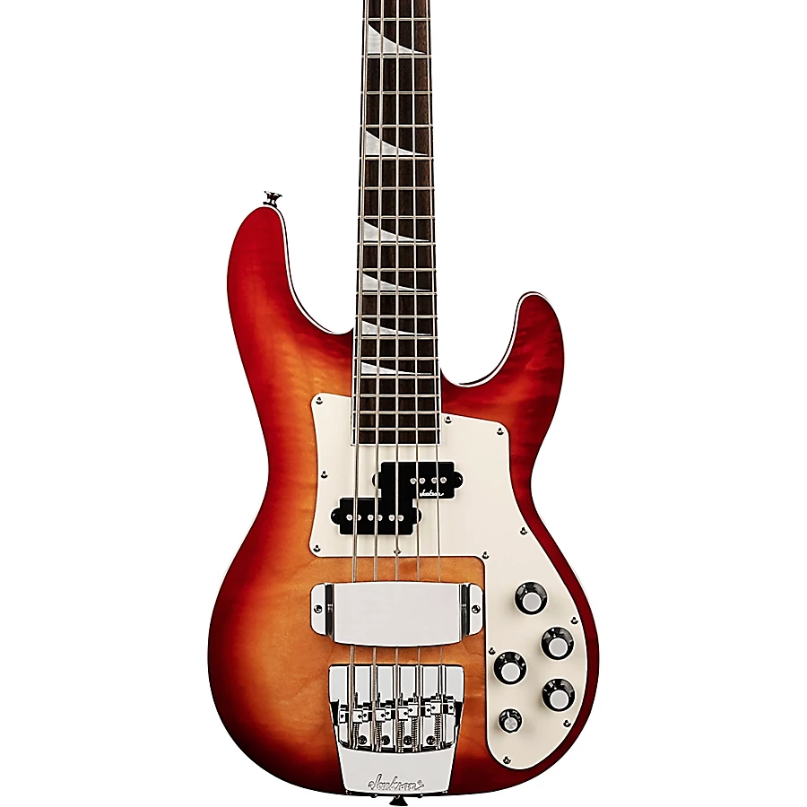 A brand-new stylish chrome Jackson Bass Bacher V hardtail bridge enhances note attack and sustain without altering your carefully crafted tone, while the sealed die-cast tuning machines keep the strings in tune, no matter how hard you dig into them.