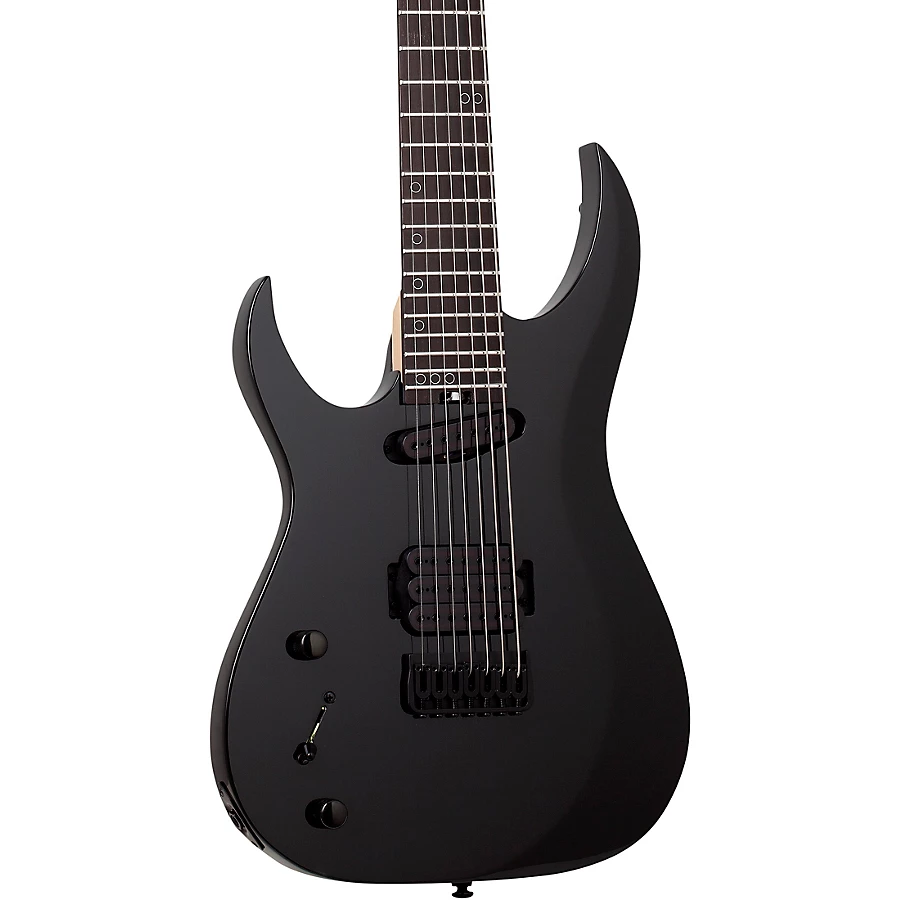 Versatility, playability, punch and clarity all define the left-handed Schecter Sunset-7 Triad electric guitar. With the technical player in mind, the Sunset Triad delivers an abundance of options in the tonal spectrum while maintaining a sleek and stealthy look. A nyatoh body resonates with a rich and warm, woody tone, while a 5-ply maple/rosewood bolt-on neck with ultra access and an Ultra-Thin C neck shape is ideal for the technically minded player. The Sunset Triad is armed with a Schecter USA Tripocalypse triple-coil bridge pickup combined with a Schecter USA Apocalypse single-coil pickup with volume/volume/5-way switch controls, leaving you with an entire universe of tonal options. Other premium features of the Sunset-7 Triad are stainless steel frets, Schecter Locking tuners, a Schecter Diamond Hardtail Plus bridge, Graph Tech nut and aluminum circle fretboard inlays.