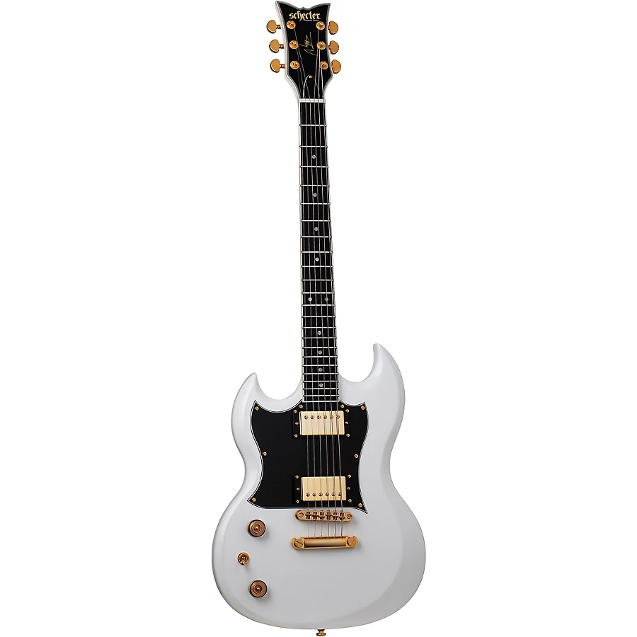 The Schecter ZV-H6LLYW66D left-handed electric guitar delivers powerful tone and extraordinary playability for discerning guitarists. Drawing design cues from Zacky Vengeance's signature Avenged Sevenfold model, this sleek guitar combines thoughtfully selected tonewoods and high-end components for studio and stage. Its resonant mahogany body joins forces with a 3-piece maple neck to produce rich, nuanced tone. The thin, fast neck profile allows effortless riffing and soloing across the smooth ebony fingerboard. Schecter Pasadena humbucking pickups serve up focused mids, tight lows and crystalline highs, while the hand-rubbed satin finish exudes understated elegance. Put pro-grade performance in your hands with the Schecter ZV-H6LLYW66D left-handed electric guitar.