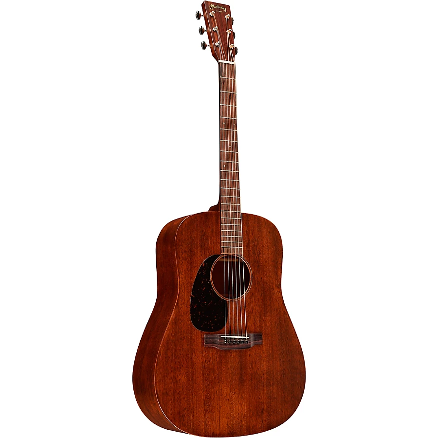 The left-handed Martin D-15M acoustic guitar looks like it came right out of the history books, and delivers a sound for the ages. Built on a dreadnought platform, the D-15M guitar boasts 14 open frets for a unique design and great range of tone. The top, back and sides are genuine solid mahogany, offering strong guitar tone, with crisp, clear subtleties in each note's definition. The vintage sound produced by the lefty D-15M acoustic is reminiscent of the Style 15 Martin guitars made popular during the 1940s. The Martin guitar is equipped with a mortise and tennon neck joint, offering the best wood binding practice ever conceived. A solid mahogany neck further complements the crisp, defined acoustic sound of this dreadnought. The bridge and fingerboard are solid East Indian rosewood, adding smooth sustain to the mix. The 14 open frets, 1.6875" nut width, 2.13" bridge string spacing, and 16" radius add comfort for your intricate fingerboard movements. Other appointments include a single-ring rosette, bone nut, solid/square taper headstock, solid East Indian rosewood headplate, diamonds and square fingerboard inlay, belly-style bridge, nickel open-geared tuning machines with butterbean knobs and a solid black ebony bridge and end pins. Dressed in a soft satin finish and featuring a Delmar tortoise color pickguard, the Martin D15M guitar glows with classic vintage looks and sound. A Softshell case is also included.