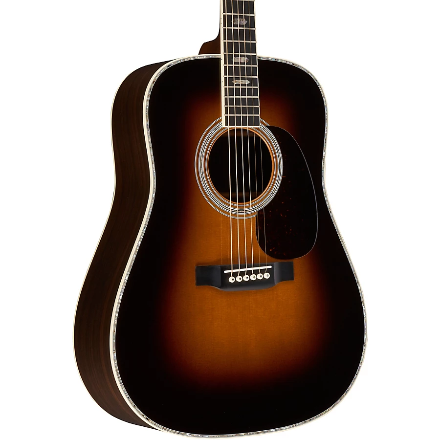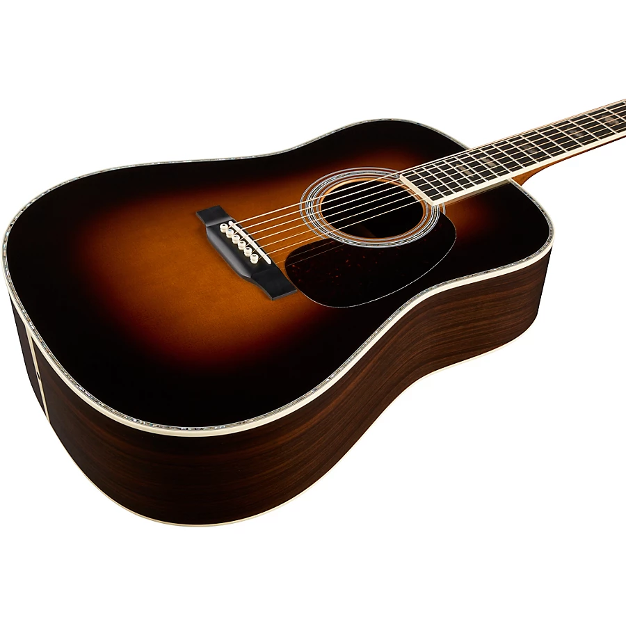 As an heirloom-quality instrument, the D-41 Standard exhibits exquisite craftsmanship. Bookmatched East Indian rosewood back and sides, an antique white binding, and a hand-rubbed aging toner finish give it a refined vintage esthetic. Open-gear tuners, a dovetail neck joint and bone nut and saddle also demonstrate Martin's commitment to traditional quality and tone.