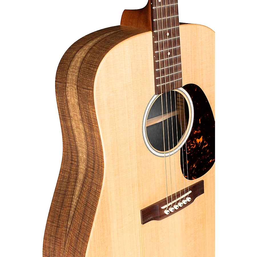 A new mother-of-pearl pattern inlay on the rosette and fingerboard lend a richness to the Martin D-X2E making it as impressive to look at as it is to play. With a Performing Artist neck, fingerboard and bridge of select hardwood, the sound transfer of this model has been greatly improved. The D-X2E Sitka spruce koa dreadnought acoustic-electric guitar is equipped with Fishman MX electronics and strung with Martin��s Authentic Acoustic Lifespan 2.0 strings. With a new, soft gig bag featuring headstock, bridge and endpin protectors, a durable water-repellent exterior, and foam padding, this model is ready to go anywhere.
