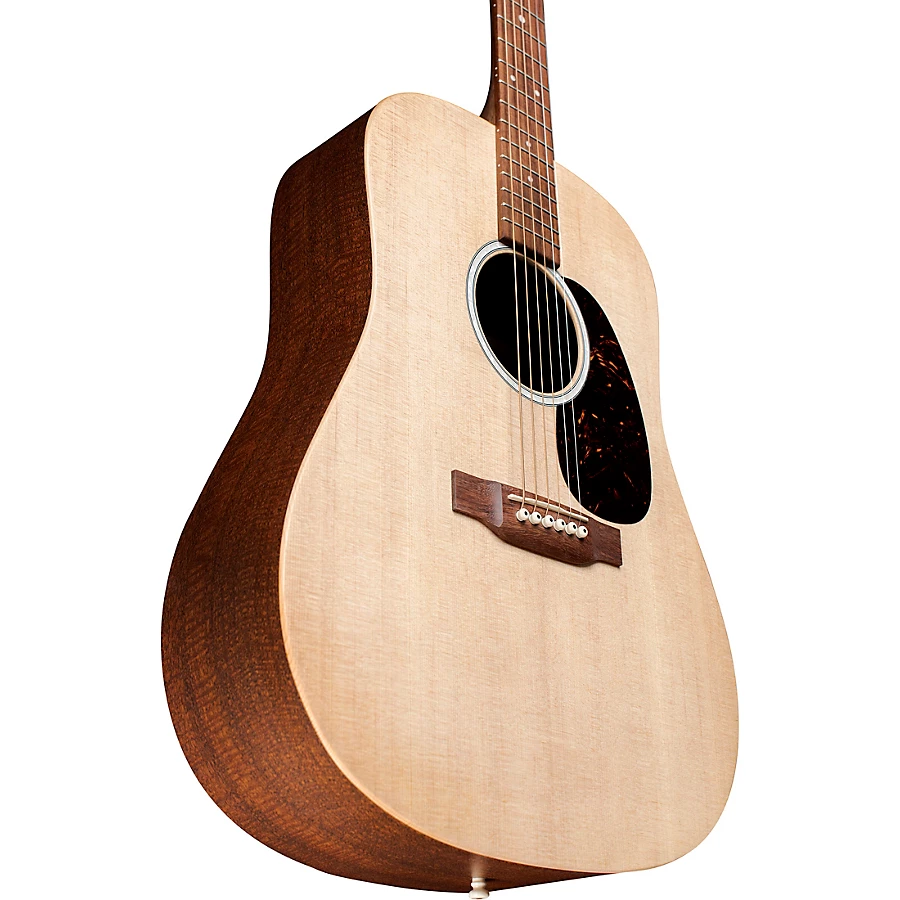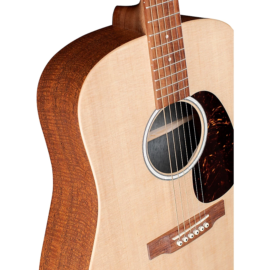 A cool mother-of-pearl pattern inlay on the rosette and fingerboard lend a richness to this D-X2E spruce mahogany dreadnought acoustic-electric guitar, making it as impressive to look at as it is to play. With a Performing Artist neck, fingerboard and bridge of select hardwood, the sound transfer of this model has been greatly improved. It is equipped with Fishman MX electronics and strung with Martin��s Authentic Acoustic Lifespan 2.0 strings. With a new, soft gig bag featuring headstock, bridge and endpin protectors, a durable water-repellent exterior, and foam padding, this model is ready to go anywhere.