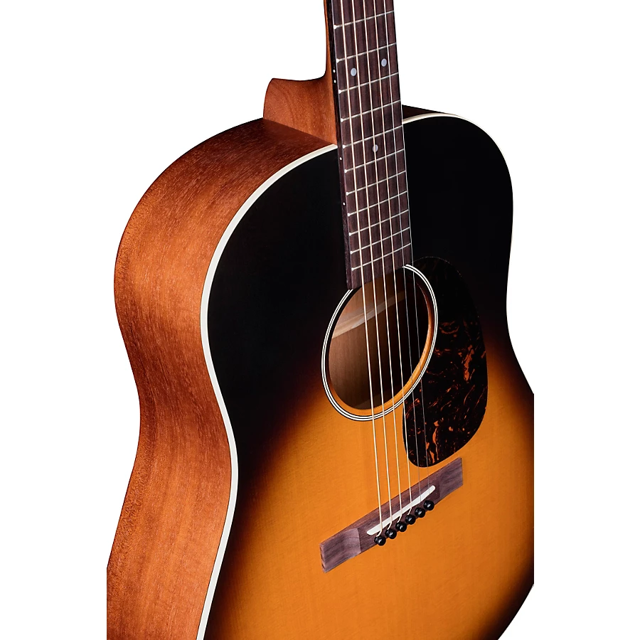 A solid Sitka spruce top paired with mahogany back and sides gives the DSS-17 Whiskey Sunset a balanced, resonant tone with crisp highs, a punchy midrange, and complex low end. The modified low oval neck and rosewood fingerboard facilitate smooth playability and response. Scalloped X-bracing provides structural support while allowing the top to vibrate freely.