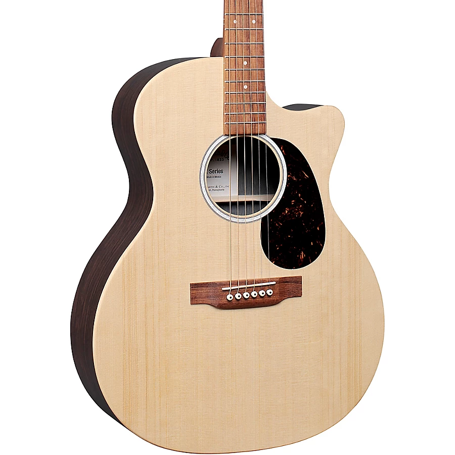 A spruce top with rosewood patterned high-pressure laminate (HPL) back and sides combined with a solid FSC Certified Richlite fingerboard and bridge, and Fishman Sonitone electronics make the GPC-X2E a very versatile guitar for players of all levels. The GPC-X2E has a Venetian cutaway and features Martin's Performance Artist neck profile with High Performance Taper and a hand-rubbed finish which make getting up and down the entire fret more smooth and comfortable on your hands. Other appointments include a scalloped spruce X bracing, a compensated white TUSQ saddle, white corian nut, multi-stripe rosette, chrome enclosed gear tuners and a faux tortoise pickguard.