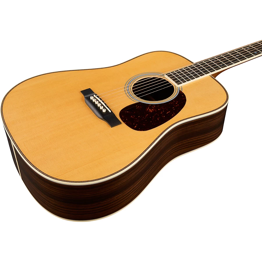 The HD-35 Standard's materials and construction blend vintage appeal with contemporary design. Its solid spruce top and rosewood body produce a warm, balanced tone, while its modified low oval neck and 1.75" nut width provide comfortable playability. Forward-shifted, scalloped 1/4" X-bracing allows the top to vibrate freely, resulting in a loud, punchy sound with superb note definition. An authentic vintage look comes from details like zig-zag back purfling, faux tortoiseshell pickguard, and antique white binding with herringbone inlay.