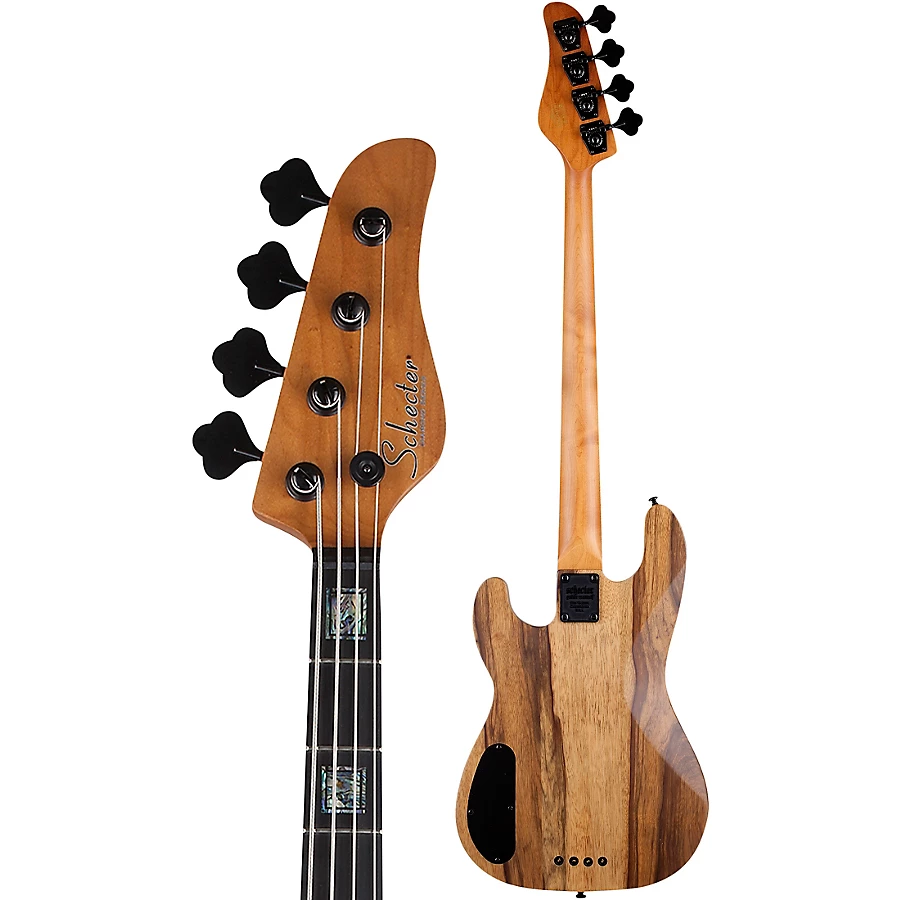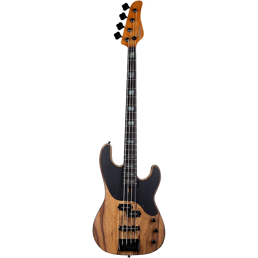 The Schecter Model-T 4 Exotic puts a new spin on a throwback bass. It features a roasted maple neck in a thin ��C��-shaped profile, with a 34�� scale for the ideal amount of string tension to accommodate lower tunings. The ebony fingerboard has 21 jumbo frets and 3-piece abalone block inlays. The body is made of black limba, coated with a satin finish to showcase its natural gradient. The Model-T 4 Exotic offers a full range of tonal possibilities thanks to its calibrated set of pickups��a Schecter MonsterTone-J at the bridge and MonsterTone-P at the neck��that deliver thunderous lows and articulate highs, shaped with two volume controls and a master tone control. Additional appointments include black hardware, a set of WSC KG400 tuners and a Schecter Custom bass bridge.