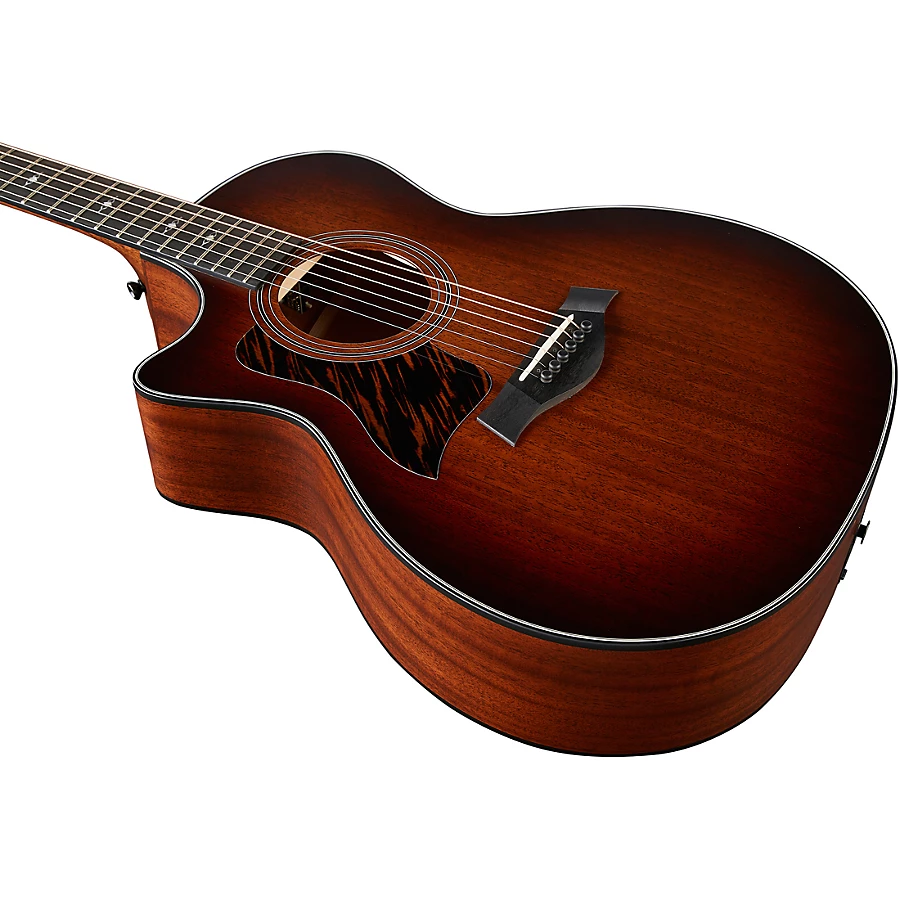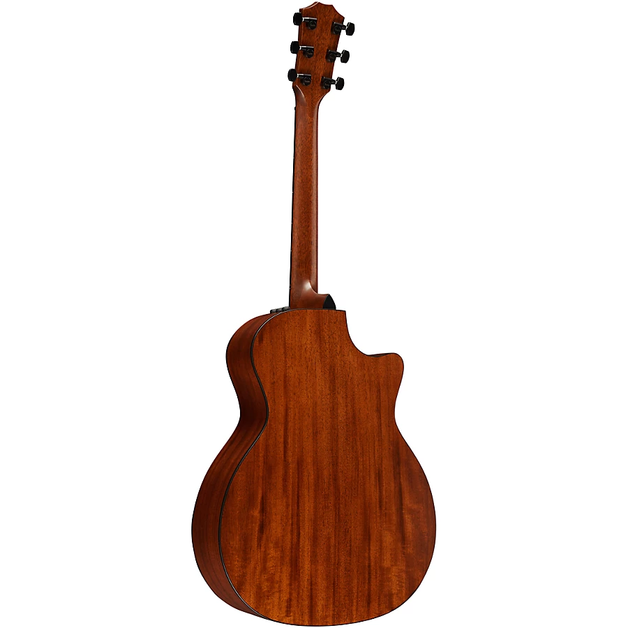 The 324ce's solid mahogany top, back and sides produce a warm, focused tone with a prominent midrange and balanced overtones. Mahogany's natural compression yields a smooth attack and rounded highs that record well in studio and cut through on stage. The hardwood top also develops a more complex tone over time, giving this guitar a sound that only improves with age. For left-handed players seeking an all-solid-wood Taylor at an accessible price, the 324ce delivers.