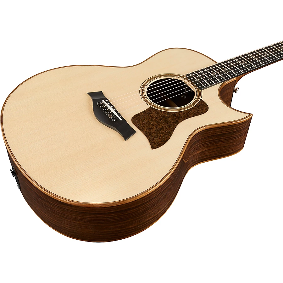 A guitar's top is the primary filter and distributor of vibrating string energy through the guitar, which means it has a huge impact on its sound. Lutz Spruce is a naturally occuring hybrid of Sitka and White spruce. Sitka is the most prevalent guitar top wood of the modern era because it blends stiffness and elasticity in just the right proportions which translates into broad dynamic range with crisp articulation. Lutz spruce takes these attributes and blends them with those of White and Englemann spruce, with an end result resembling old Adirondack spruce. When combined with Taylor's bracing architecture, guitars are more powerful, richer and louder than before. Solid Indian rosewood back and sides complement the Lutz top with sound that's made it one of the most popular tone woods ever. Rosewood produces the strongest bass response among the tone woods commonly used for guitars, with a slightly scooped midrange. Rosewood's sweeping frequency range - deep lows that assert a throaty growl with sparkling highs - rings out with bell-like, high-fidelity clarity. It yields a full-range acoustic voice with complex overtones and extended sustain.