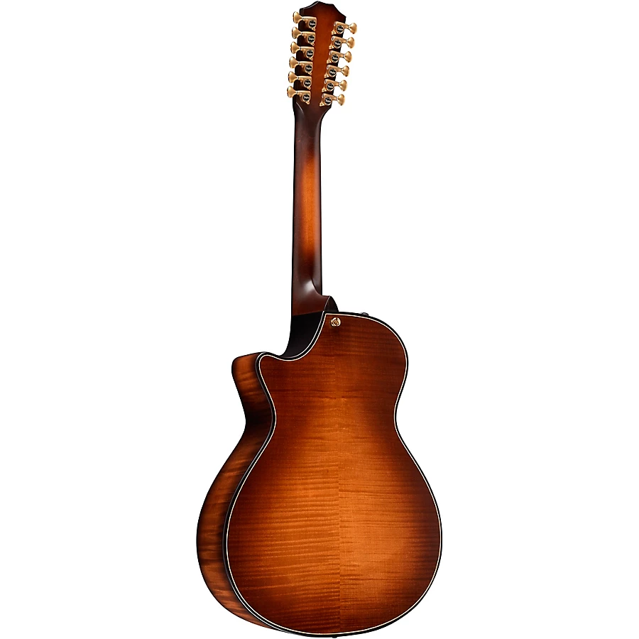 The Taylor Builder's Edition 652ce V-Class 12-String Grand Concert acoustic-electric guitar. This premium 12-string acoustic-electric guitar boasts a contoured cutaway Grand Concert body, a torrified Sitka spruce top and figured big leaf maple back and sides. The hard rock maple neck and ebony fingerboard provide a familiar feel for electric guitar players. The beveled cutaway and armrest offer playing comfort, while the Curve Wing bridge with double-mounted string anchoring provides added stability. The reverse-strung setup places the fundamental strings above the octave strings, yielding a meatier tone where the fundamental note is slightly more prominent. Delivering a reliable amplified tone, the ES2 electronics system includes a preamp and pickup.