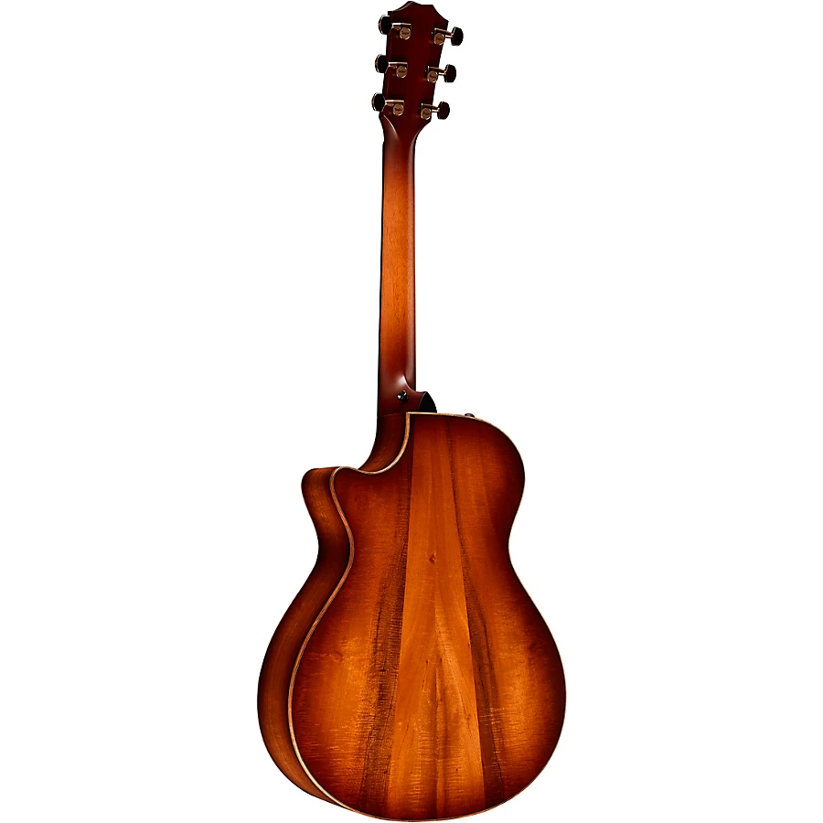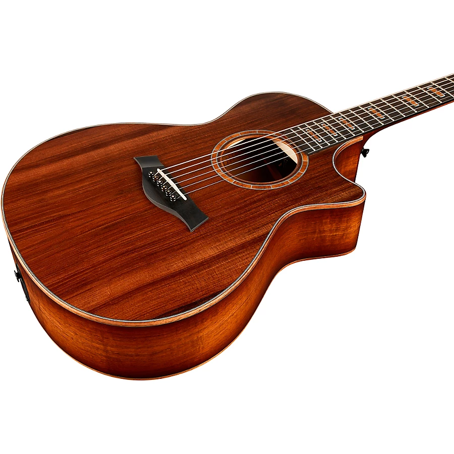 This Taylor Custom Grand Concert acoustic-electric guitar boasts back and sides of A-grade figured Hawaiian koa in a four-piece configuration with a Simons wedge, a sinker redwood top, and V-Class interior bracing. The Taylor ES2 electronics feature a built-in TaylorSense unit. Custom appointments include a Faceted single-ring rosette in shell and Hawaiian koa with a bound soundhole, Hawaiian koa body binding, genuine West African ebony fretboard binding, stained bone bridge pins with awabhi dots, and polished bronze tuners. Other features include S-Curve fretboard inlays in shell and Hawaiian koa, and a full-body silent satin finish.