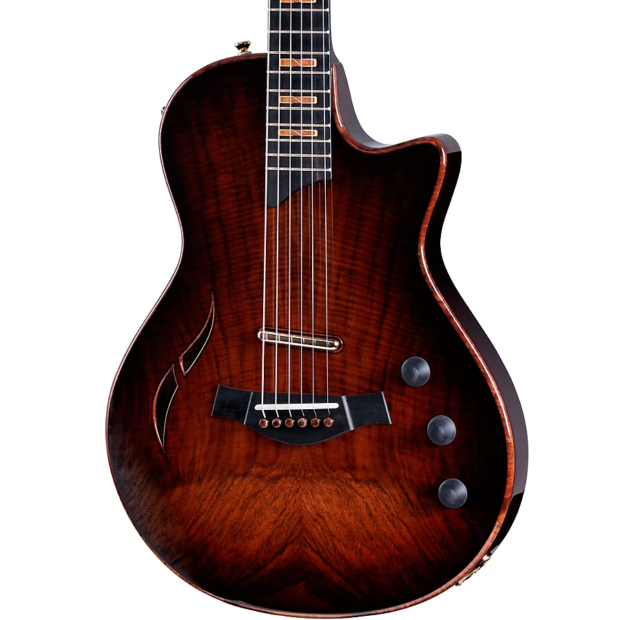 With gold Gotoh 510 tuners, gold strap pins and a gloss chocolate finish, the T5z exudes craftsmanship. The fingerboard inlays made of boxwood and Hawaiian koa wood complement the figured walnut top. A custom boxwood peghead logo and black purfling around the F-holes and top edge provide an elegant look. An integrated armrest and chamfered body edges demonstrate Taylor's attention to comfort and playability. Overall, the T5z is a stunning guitar that makes a visual statement.